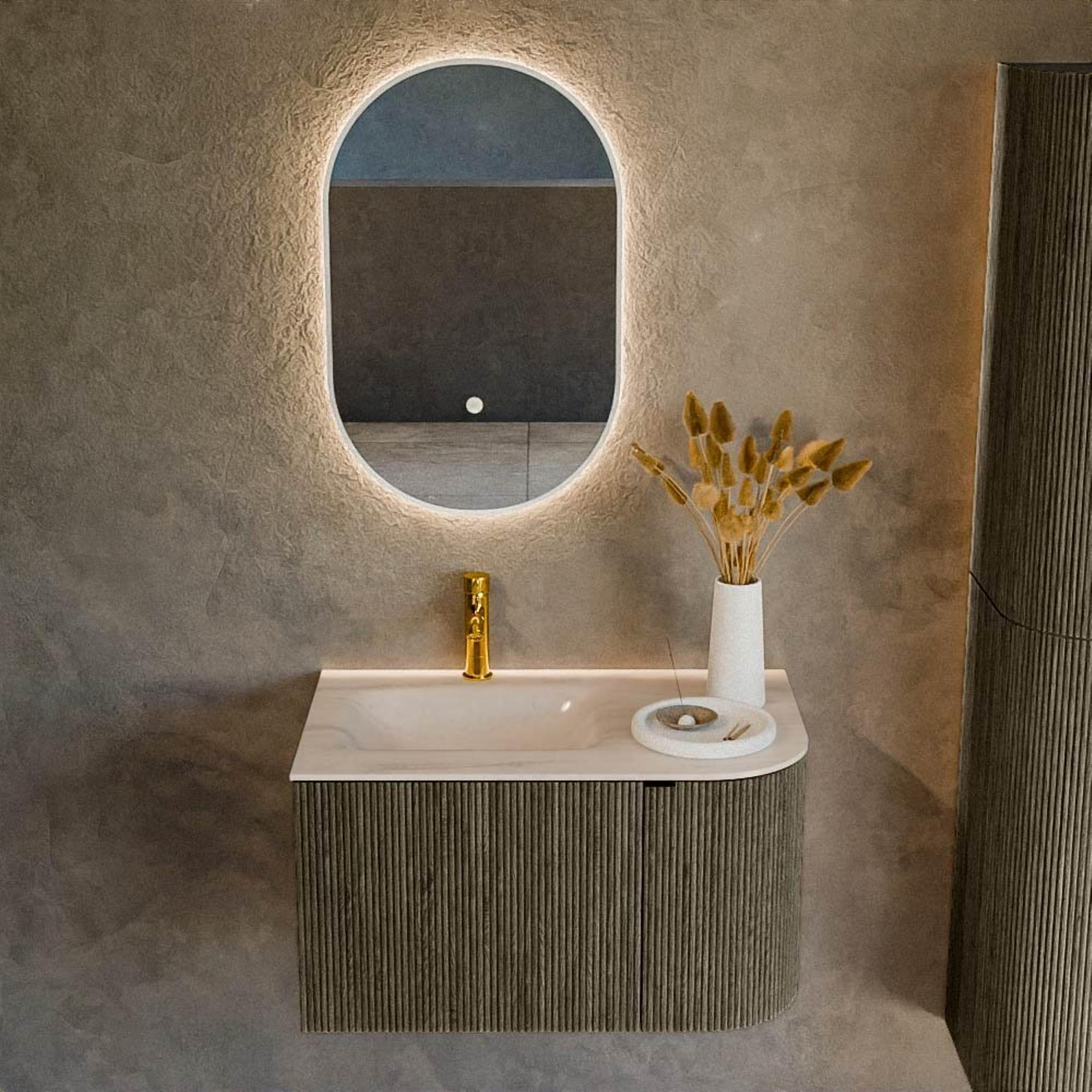 MONDIAZ KURVE-DLUX 75cm badmeubel ronding Rechts kleur Shadow met 1 lade en 1 deur. Wastafel GRUNNE Links 1 kraangat Meli.