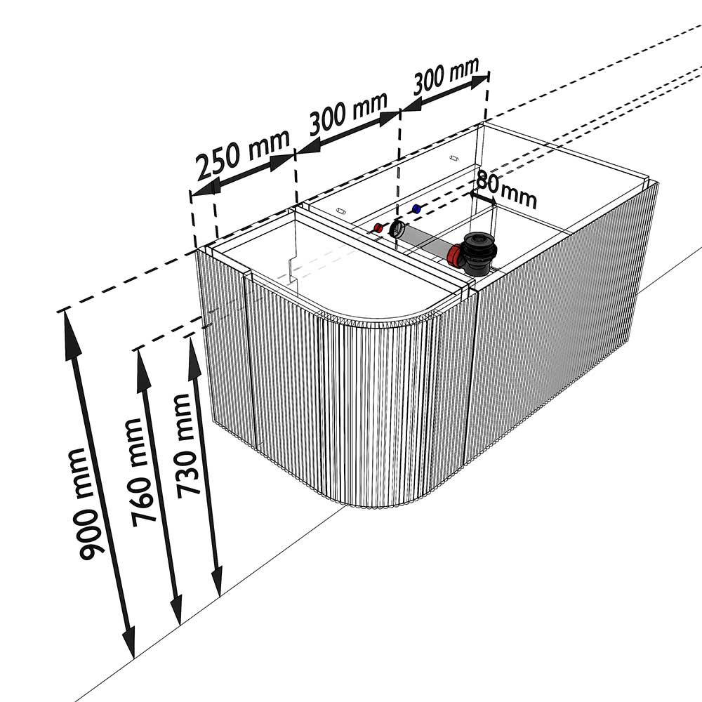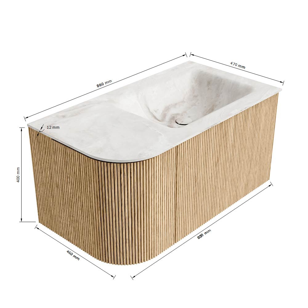 MONDIAZ KURVE-DLUX 85cm badmeubel ronding Links kleur Ruby met 1 lade en 1 deur. Wastafel CLOUD Rechts zonder kraangat Nata.