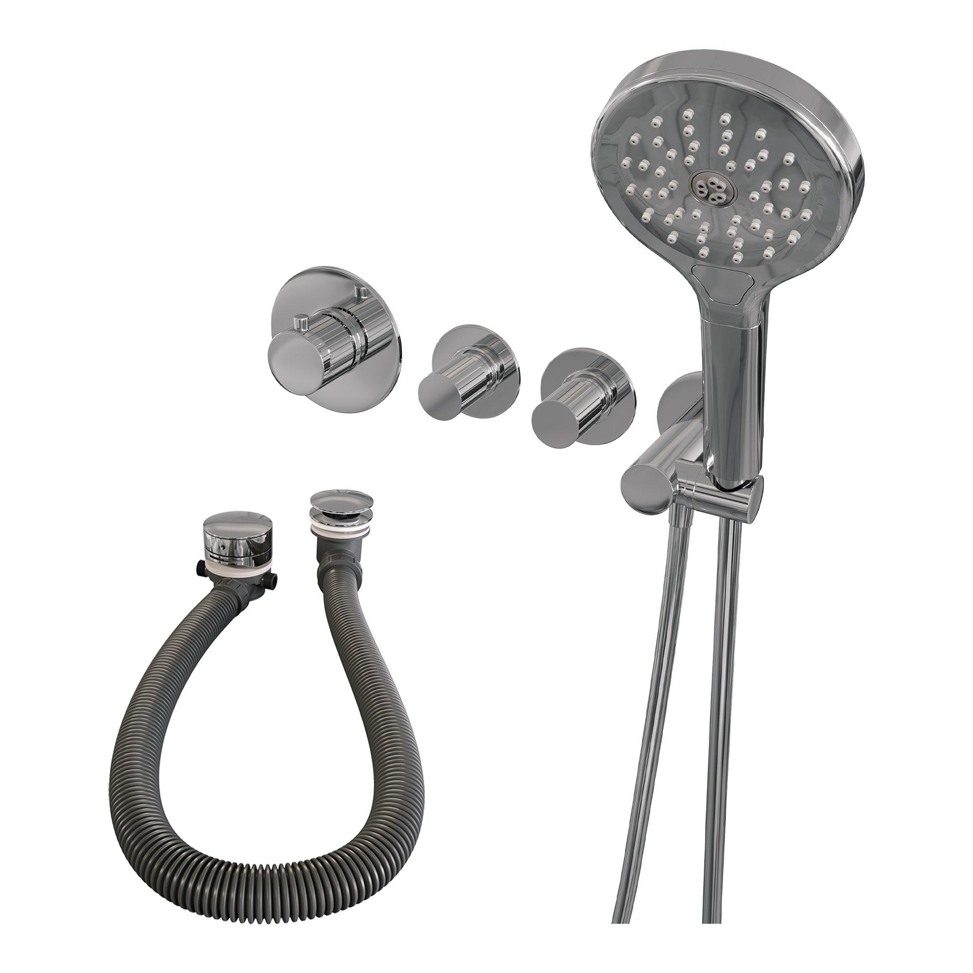 Transformeer jouw badkamer met deze hoogwaardige inbouw badkraan die niet alleen functioneel is, maar ook een stijlvolle toevoeging vormt. Dankzij het strakke, chromen design krijgt je badkamer een moderne en tijdloze uitstraling. Deze set biedt je alles wat je nodig hebt voor een comfortabele badervaring: een badvulcombinatie, een handdouche met drie standen en een flexibele doucheslang. De thermostatische bediening zorgt ervoor dat je altijd geniet van een constante, aangename watertemperatuur, zonder plotselinge temperatuurschommelingen. Zo wordt elke douche- of badmoment een moment van ontspanning en luxe. De combinatie van kwaliteit en gebruiksgemak maakt dit product een waardevolle investering voor jouw badkamer, waar je jarenlang plezier van hebt.