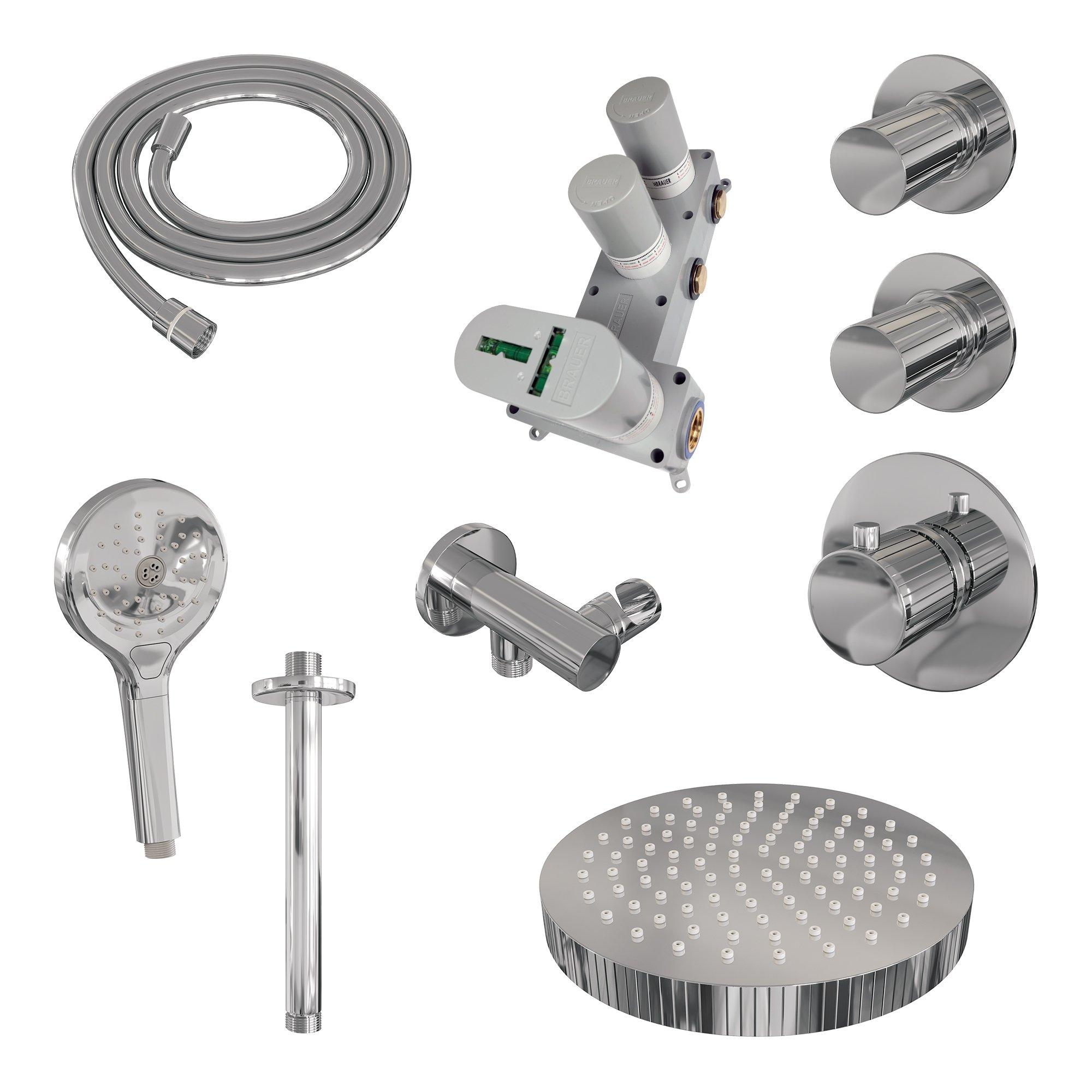 BRAUER Stripe Thermostatische Inbouw Regendouche - SET 06 - 25cm douchekop - plafondarm - 3-standen handdouche - doucheslang - wandaansluitbocht - chroom
