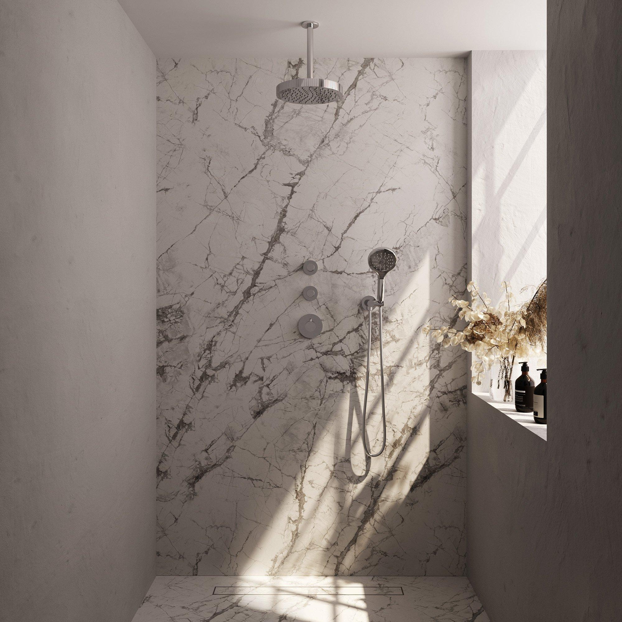 Met een royale 25 cm regendouchekop en een handdouche met drie standen biedt deze set maximale flexibiliteit. Of je nu wilt genieten van een brede regenstraal of juist een gerichte straal met de handdouche, je hebt altijd de juiste optie binnen handbereik. De thermostatische bediening zorgt voor een veilige en precieze temperatuurinstelling, terwijl de meegeleverde plafondarm en wandaansluitbocht zorgen voor een eenvoudige en nette installatie. Zo ervaar je dagelijks optimaal doucheplezier zonder gedoe.