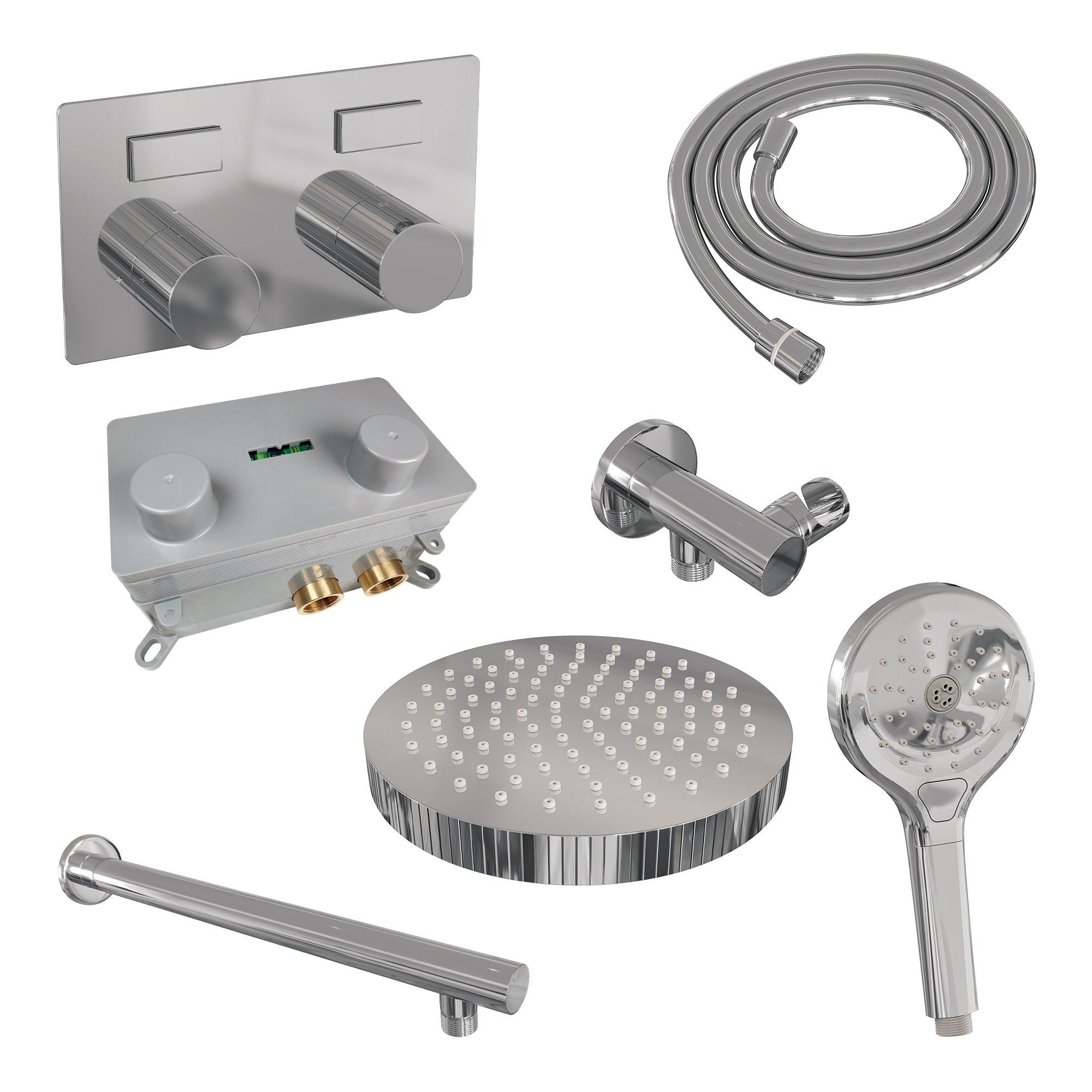 Deze set is voorzien van vier drukknoppen waarmee je eenvoudig schakelt tussen de regendouche, de 3-standen handdouche en andere functies. De handdouche biedt flexibiliteit en gemak, ideaal voor het gericht afspoelen of schoonmaken van de douchecabine. Dankzij de thermostaat blijft de temperatuur constant, wat veilig en comfortabel douchen garandeert. De meegeleverde doucheslang en wandaansluitbocht maken de installatie compleet en zorgen voor een nette afwerking. Zo geniet je van een doordacht systeem dat jouw dagelijkse douchebeurt moeiteloos verbetert.
