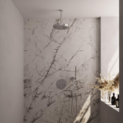 Deze regendouche is een echte blikvanger dankzij het tijdloze, ronde ontwerp en de glanzende chroomafwerking. Het minimalistische uiterlijk past perfect in zowel moderne als klassieke badkamers. Door de inbouwmontage blijft de wand strak en overzichtelijk, wat bijdraagt aan een rustige en luxe sfeer. Zo creëer je een badkamer die niet alleen functioneel is, maar ook een lust voor het oog. Het design is zorgvuldig vormgegeven om een gevoel van elegantie en verfijning te bieden, waardoor jouw badkamer een plek wordt waar je graag tijd doorbrengt.