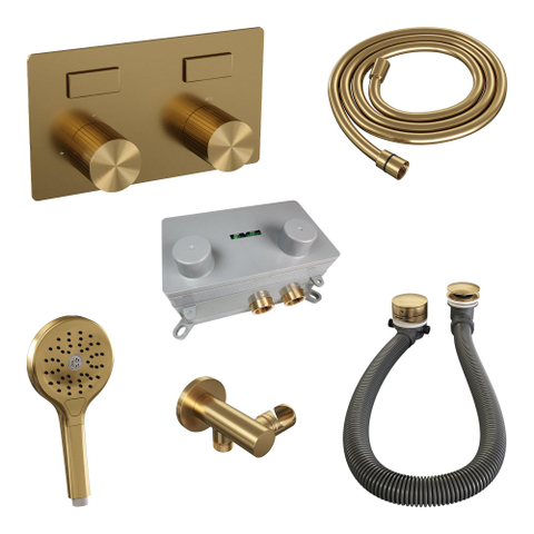 BRAUER Stripe Thermostatische Badkraan - drukknoppen - SET 03 - inbouw - badvulcombinatie - staaf handdouche - doucheslang - wandaansluitbocht - goud geborsteld PVD