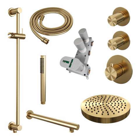 BRAUER Stripe Thermostatische Inbouw Regendouche - SET 07 - 25cm douchekop - rechte muurarm - staaf handdouche - doucheslang - geïntegreerde glijstang - goud geborsteld PVD