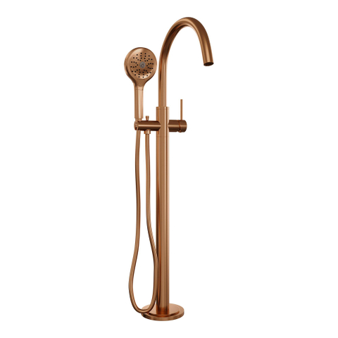 Met deze vrijstaande badmengkraan geef je jouw badkamer een indrukwekkende upgrade. Het warme koper met een geborstelde PVD-afwerking zorgt voor een tijdloze uitstraling die moeiteloos past bij zowel moderne als klassieke badkamers. Dankzij het vrijstaande ontwerp creëer je een luxe en open sfeer rondom je bad, waardoor het badmoment verandert in een ware beleving. De geïntegreerde 3-standen handdouche met bijbehorende doucheslang biedt je bovendien extra flexibiliteit en comfort, ideaal om jezelf of het bad snel en gemakkelijk te spoelen. Dit is niet zomaar een kraan, maar een stijlvolle blikvanger die functionaliteit en design perfect combineert en jouw badkamer naar een hoger niveau tilt.