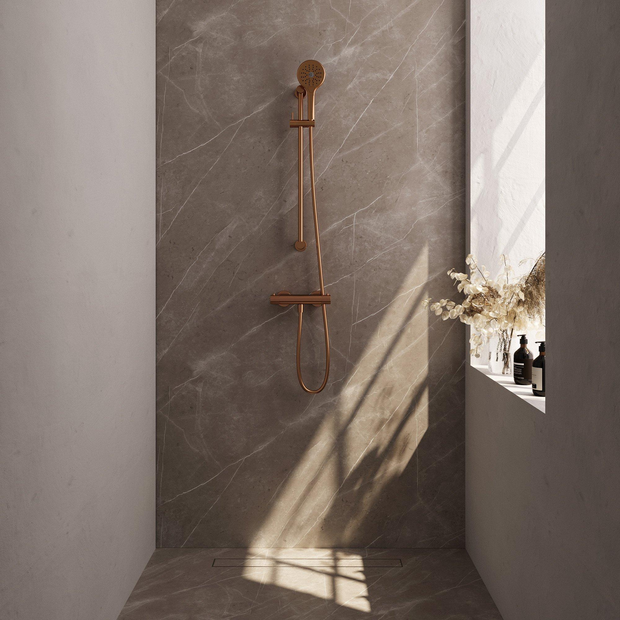 Met deze opbouw douche thermostaatkraan geef je jouw badkamer direct een luxe en moderne uitstraling. De combinatie van het warme koper met de geborstelde afwerking zorgt voor een tijdloos en stijlvol design dat moeiteloos past in diverse interieurstijlen. Dankzij de slimme opbouwmontage is de installatie eenvoudig en snel, waardoor je binnen no-time kunt genieten van een comfortabele en veilige douche-ervaring. De meegeleverde glijstang en de handdouche met drie standen bieden je volop flexibiliteit en gebruiksgemak. Zo bepaal je zelf de waterstraal die het beste bij jouw stemming en wensen past. Deze set is niet alleen een lust voor het oog, maar ook een praktische toevoeging die jouw dagelijkse routine verrijkt en je badkamer transformeert tot een plek van ontspanning en verwennerij.
