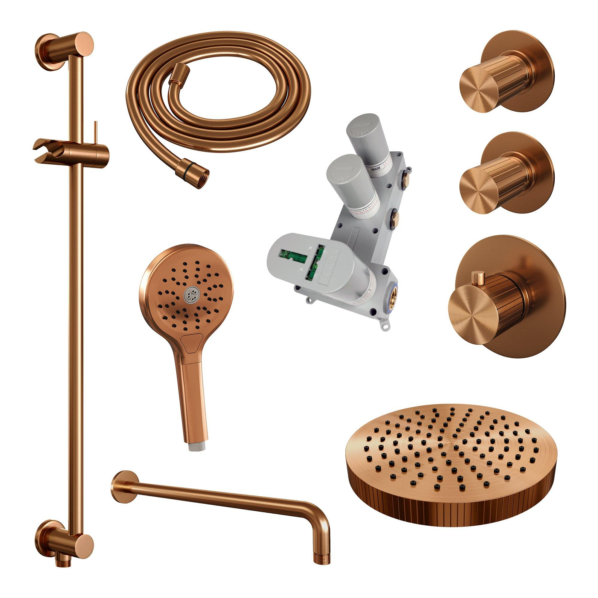 BRAUER Stripe Thermostatische Inbouw Regendouche - SET 11 - 25cm douchekop - gebogen muurarm - 3-standen handdouche - doucheslang - geïntegreerde glijstang - koper geborsteld PVD
