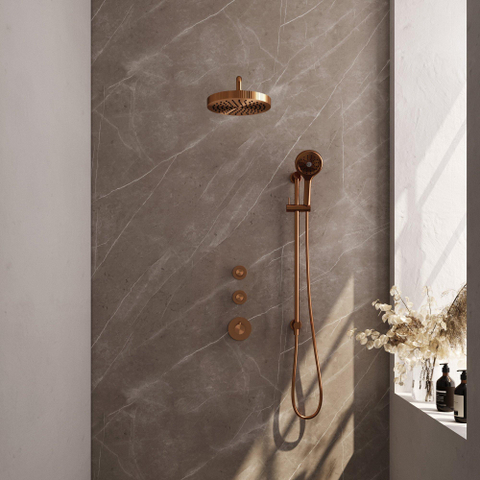 Stel je voor: een badkamer die niet alleen functioneel is, maar ook een oase van rust en luxe uitstraalt. Met deze hoogwaardige inbouw regendouche transformeer je jouw douche-ervaring tot een moment van pure ontspanning. Het warme, geborstelde koper zorgt voor een tijdloze uitstraling die moeiteloos past in zowel moderne als klassieke badkamers. Dankzij de slimme combinatie van een royale regendouchekop en een veelzijdige handdouche geniet je van een complete douchebeleving, afgestemd op jouw wensen. De geïntegreerde glijstang maakt het eenvoudig om de handdouche op de perfecte hoogte te plaatsen, terwijl de gebogen muurarm zorgt voor een elegante afwerking. Deze set biedt niet alleen comfort, maar ook betrouwbaarheid en duurzaamheid, zodat je jarenlang zorgeloos kunt genieten van je badkamer. Het inbouwontwerp zorgt voor een strakke, opgeruimde look, waarbij alle techniek netjes uit het zicht blijft. Zo creëer je een badkamer die niet alleen mooi is om te zien, maar ook praktisch in gebruik.