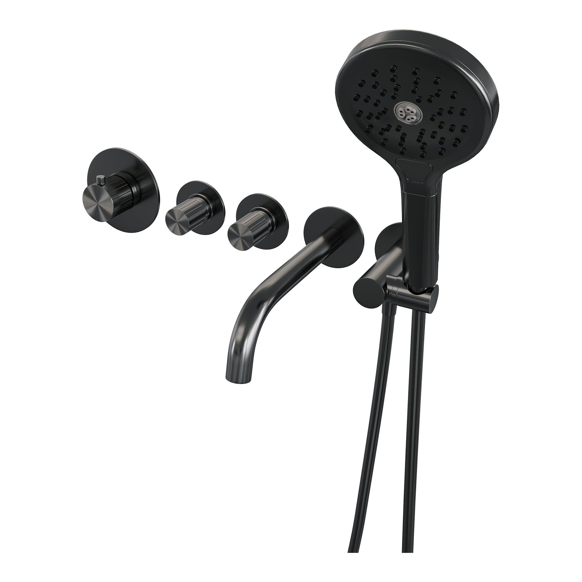 Met deze inbouw badkraan transformeer je jouw badkamer in een oase van comfort en stijl. De combinatie van een strak design met een hoogwaardige afwerking in gunmetal geborsteld PVD zorgt voor een moderne en luxe uitstraling die direct opvalt. Dankzij de thermostatische bediening geniet je altijd van de perfecte watertemperatuur, zonder plotselinge temperatuurschommelingen. De meegeleverde handdouche met drie standen biedt je bovendien veelzijdigheid, of je nu snel wilt spoelen of juist ontspannen wilt douchen. Met deze set voeg je niet alleen functionaliteit toe, maar ook een verfijnde sfeer die je badkamer compleet maakt.