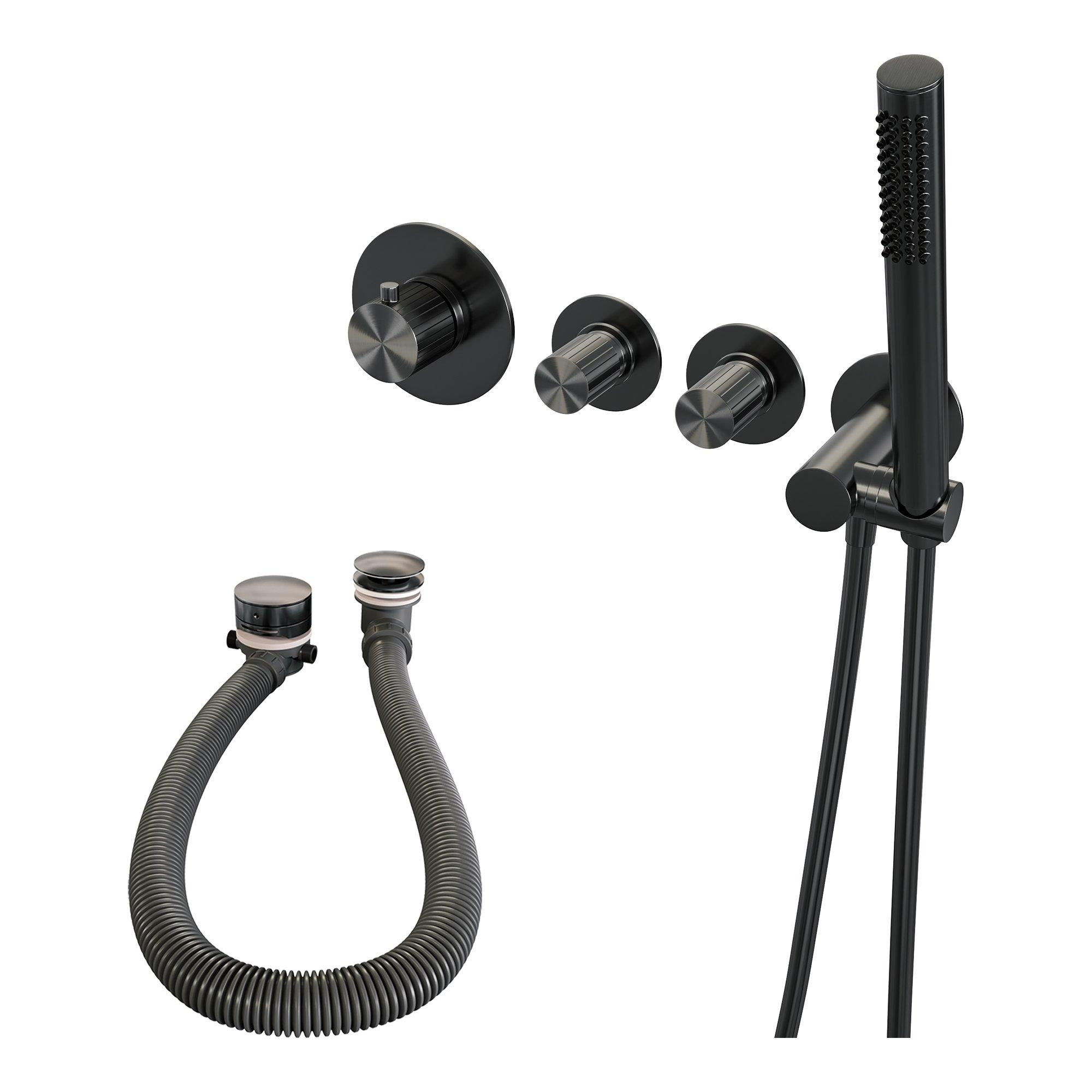 BRAUER Stripe Thermostatische Badkraan - SET 01 - inbouw - badvulcombinatie - staaf handdouche - doucheslang - wandaansluitbocht - gunmetal geborsteld PVD
