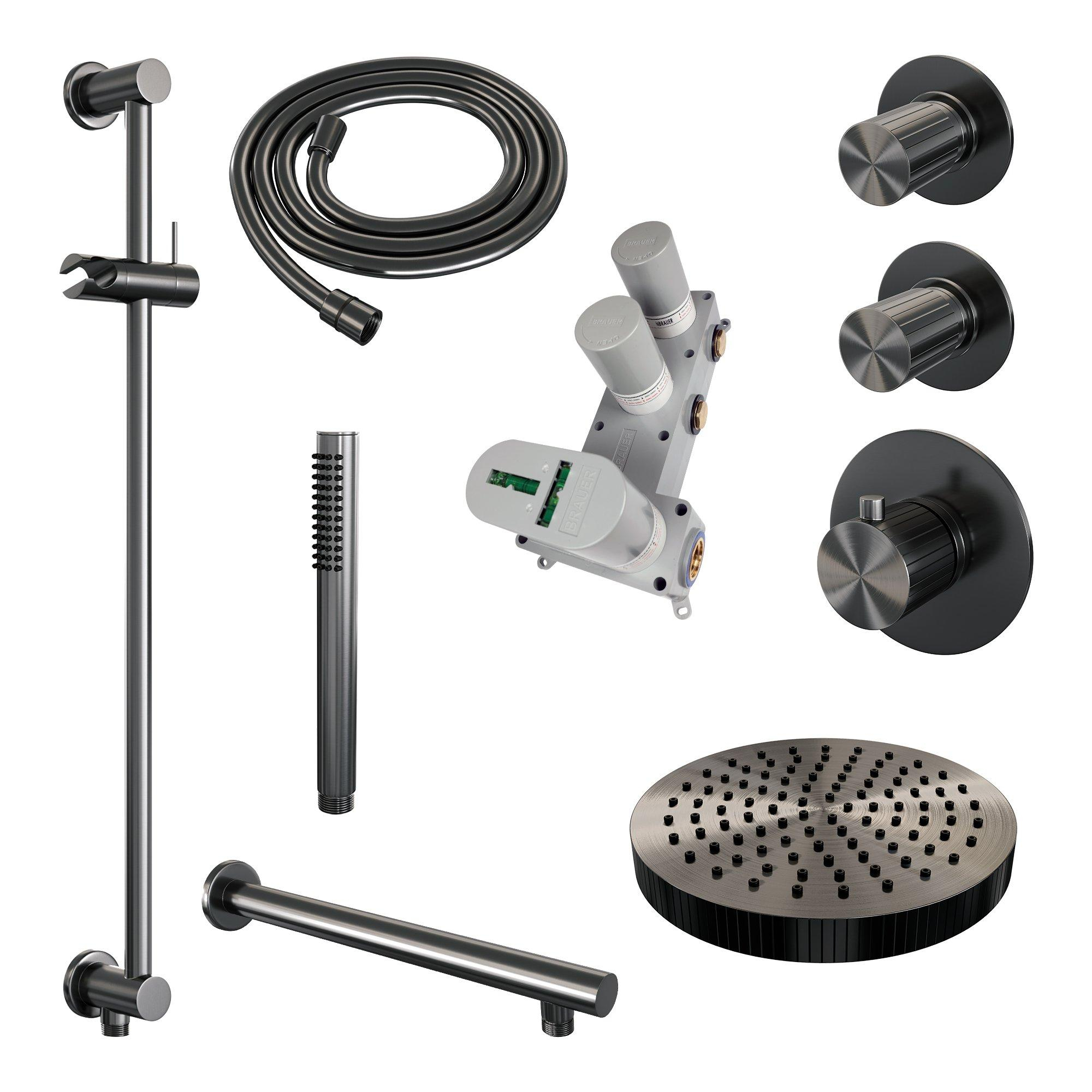 BRAUER Stripe Thermostatische Inbouw Regendouche - SET 07 - 25cm douchekop - rechte muurarm - staaf handdouche - doucheslang - geïntegreerde glijstang - gunmetal geborsteld PVD
