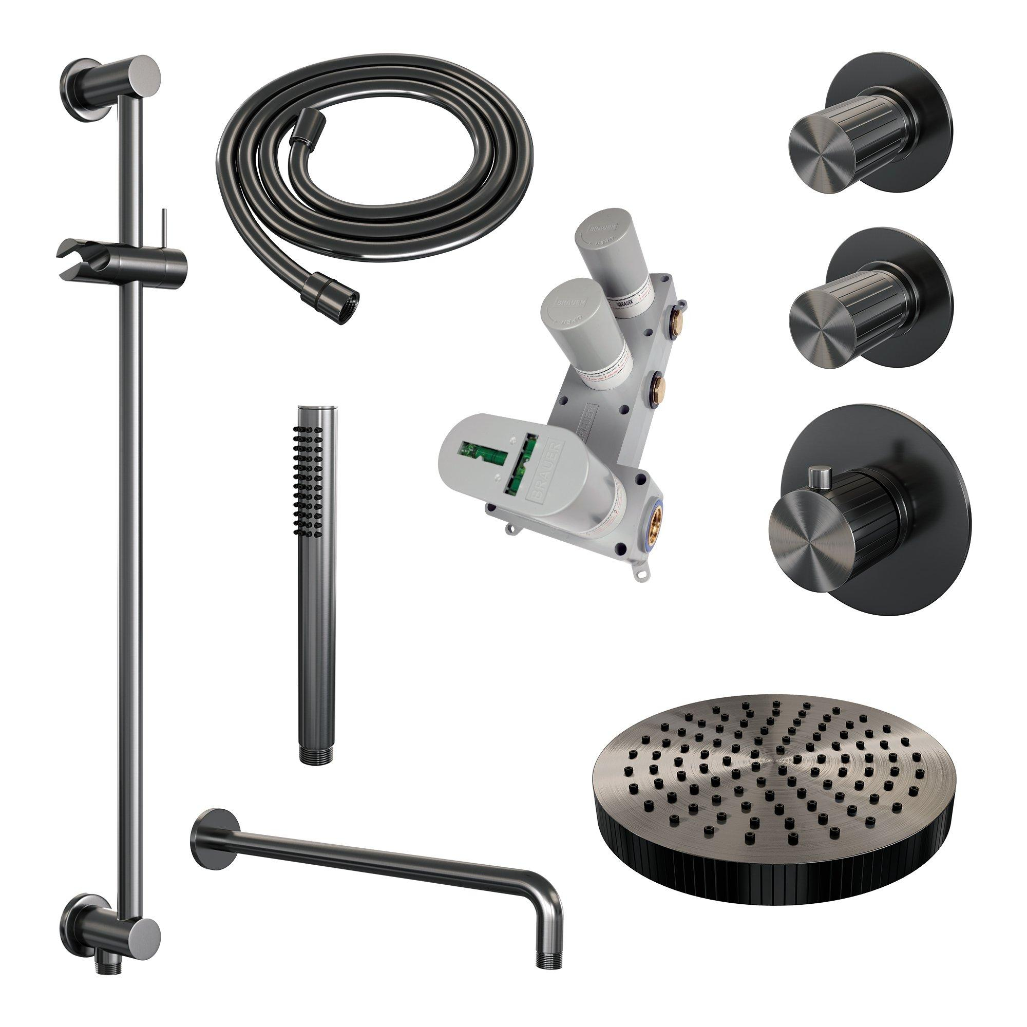 BRAUER Stripe Thermostatische Inbouw Regendouche - SET 08 - 25cm douchekop - gebogen muurarm - staaf handdouche - doucheslang - geïntegreerde glijstang - gunmetal geborsteld PVD