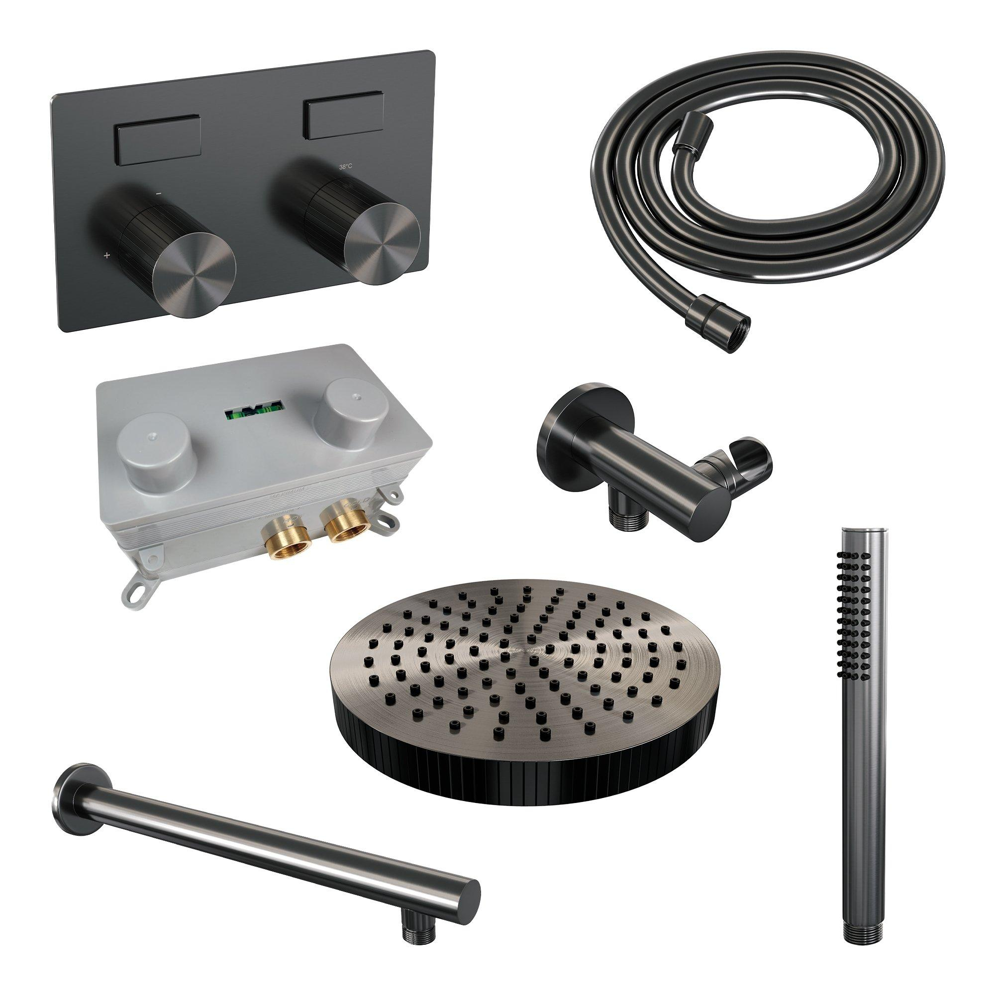 BRAUER Stripe Thermostatische Inbouw Regendouche - drukknoppen - SET 25 - 25cm douchekop - rechte muurarm - staaf handdouche - doucheslang - wandaansluitbocht - gunmetal geborsteld PVD