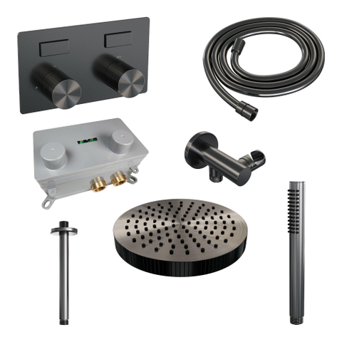 BRAUER Stripe Thermostatische Inbouw Regendouche - drukknoppen - SET 27 - 25cm douchekop - plafondarm - staaf handdouche - doucheslang - wandaansluitbocht - gunmetal geborsteld PVD