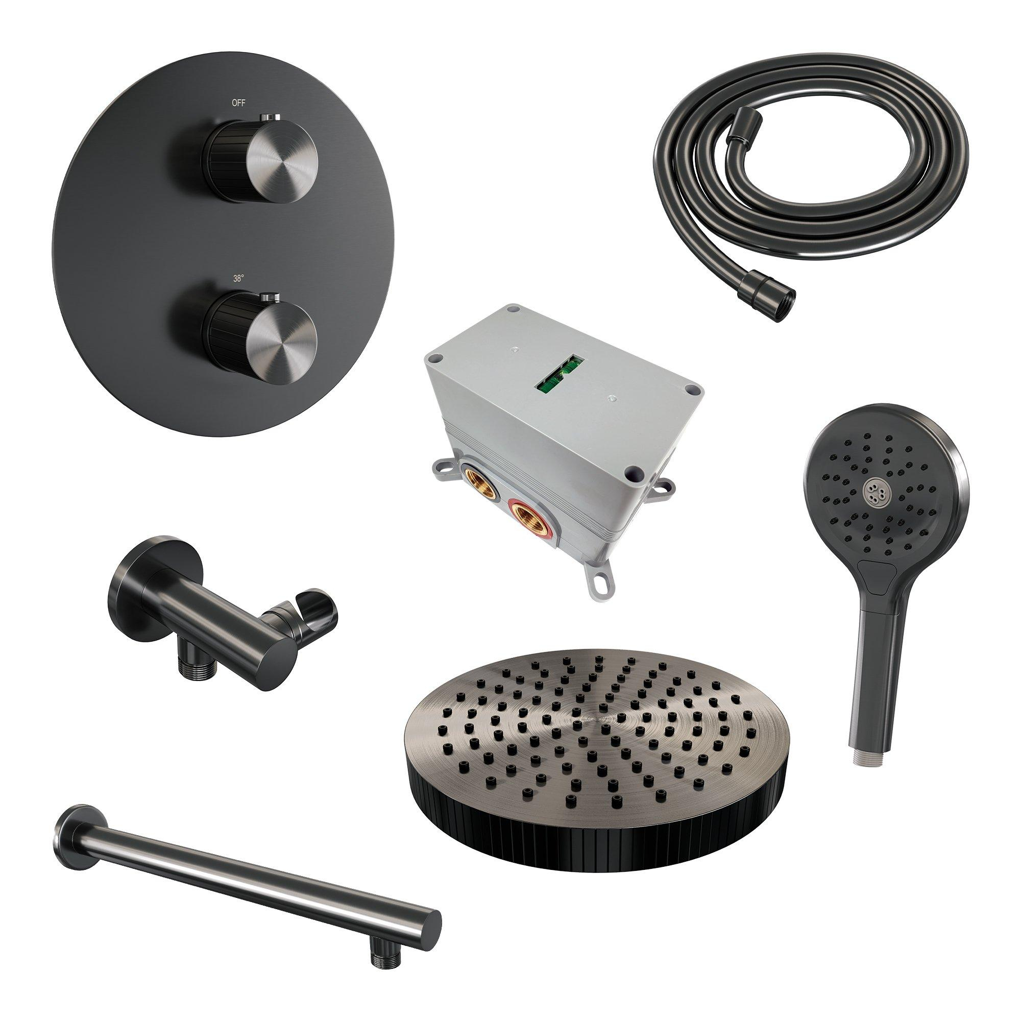 BRAUER Stripe Thermostatische Inbouw Regendouche - 3-weg - rond - SET 40 - 25cm douchekop - rechte muurarm - 3-standen handdouche - doucheslang - wandaansluitbocht - gunmetal geborsteld PVD