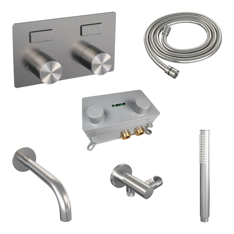 BRAUER Stripe Thermostatische Badkraan - drukknoppen - SET 03 - inbouw - uitloop - staaf handdouche - doucheslang - wandaansluitbocht - RVS-kleurig geborsteld PVD
