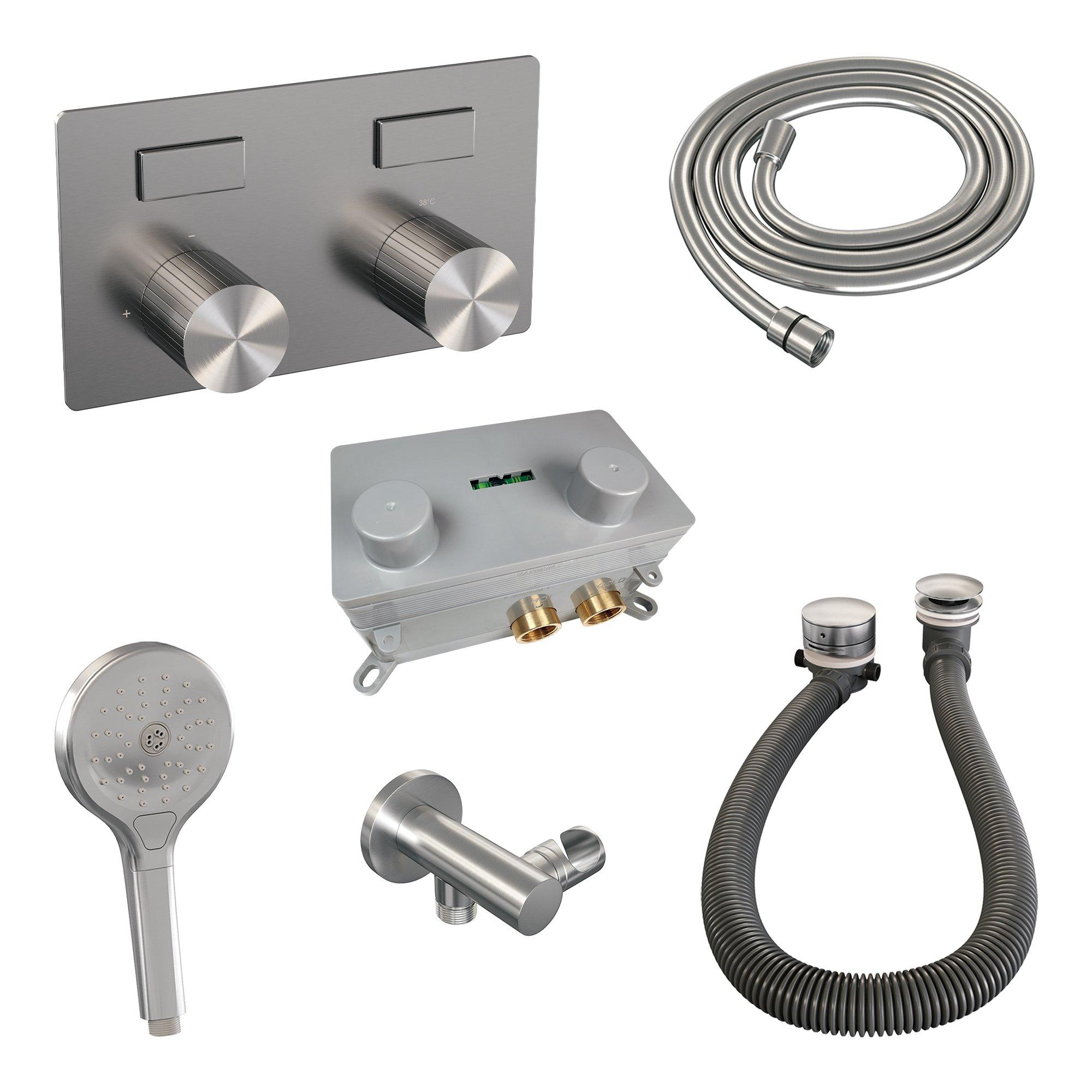 BRAUER Stripe Thermostatische Badkraan - drukknoppen - SET 03 - inbouw - badvulcombinatie - staaf handdouche - doucheslang - wandaansluitbocht - RVS-kleurig geborsteld PVD