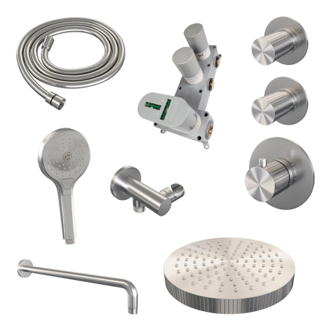 Deze regendouche valt direct op door zijn elegante en moderne ontwerp. De geborstelde RVS-kleurige PVD-afwerking geeft het geheel een subtiele glans zonder te overheersen, waardoor het perfect past in zowel strakke als warme badkamerinterieurs. Het minimalistische design met drie bedieningsgrepen zorgt voor een rustige en overzichtelijke uitstraling. Zo geniet je niet alleen van een kwalitatief hoogstaand product, maar ook van een stijlvolle blikvanger die jouw badkamer een upgrade geeft. Door de tijdloze look blijft deze regendouche jarenlang een pronkstuk in jouw badkamer.