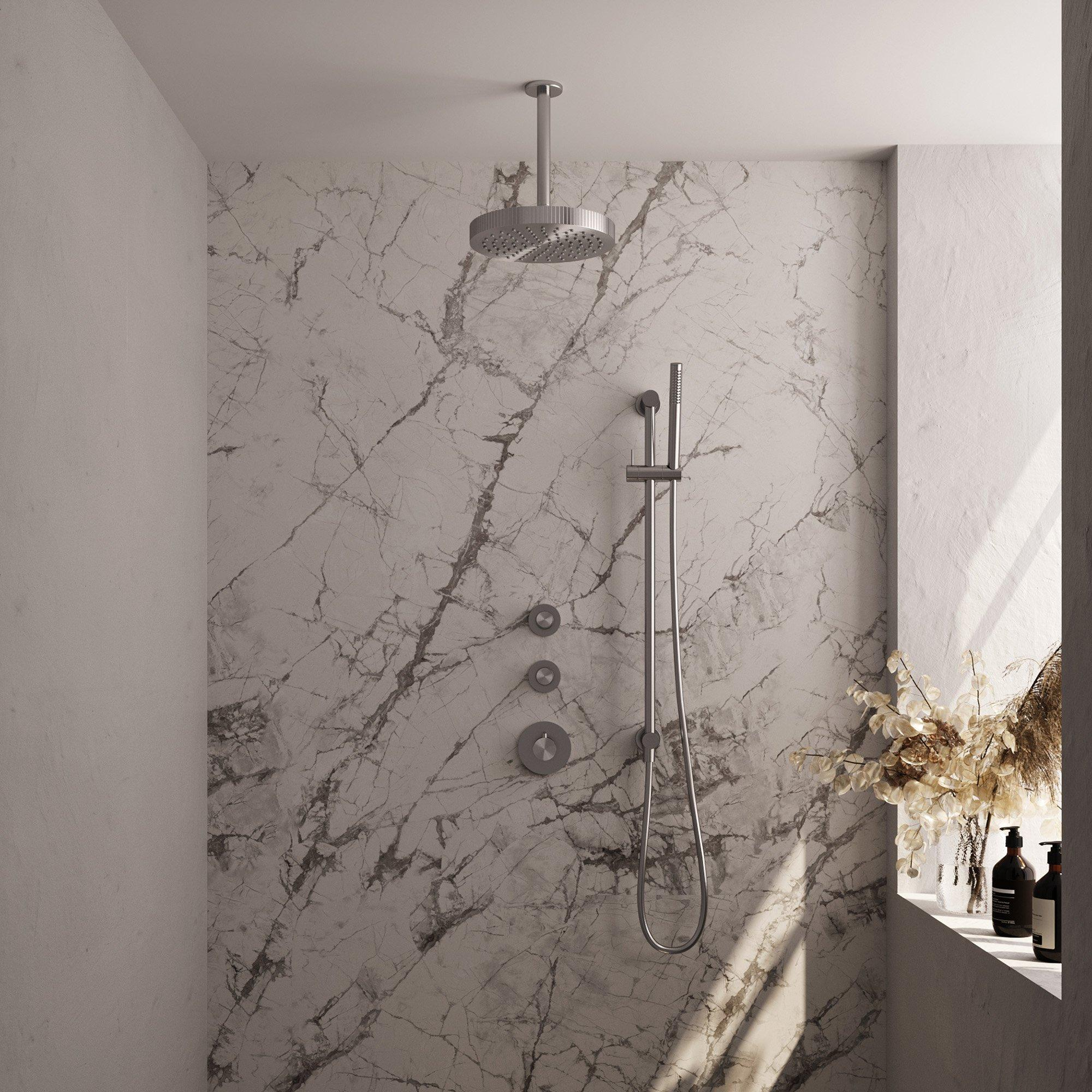 Met de geïntegreerde glijstang, de plafondarm en de handdouche met flexibele doucheslang heb je maximale controle over je douche-ervaring. De 25 cm grote regendouchekop zorgt voor een brede, zachte waterstraal, terwijl de handdouche ideaal is voor gerichte reiniging of het afspoelen van lastige plekken. De thermostatische bediening garandeert een veilige en constante temperatuur, wat vooral prettig is voor gezinnen met kinderen. Dankzij het inbouwontwerp blijft je badkamer strak en overzichtelijk, zonder zichtbare leidingen of kranen. Zo geniet je van een opgeruimde en comfortabele doucheplek.