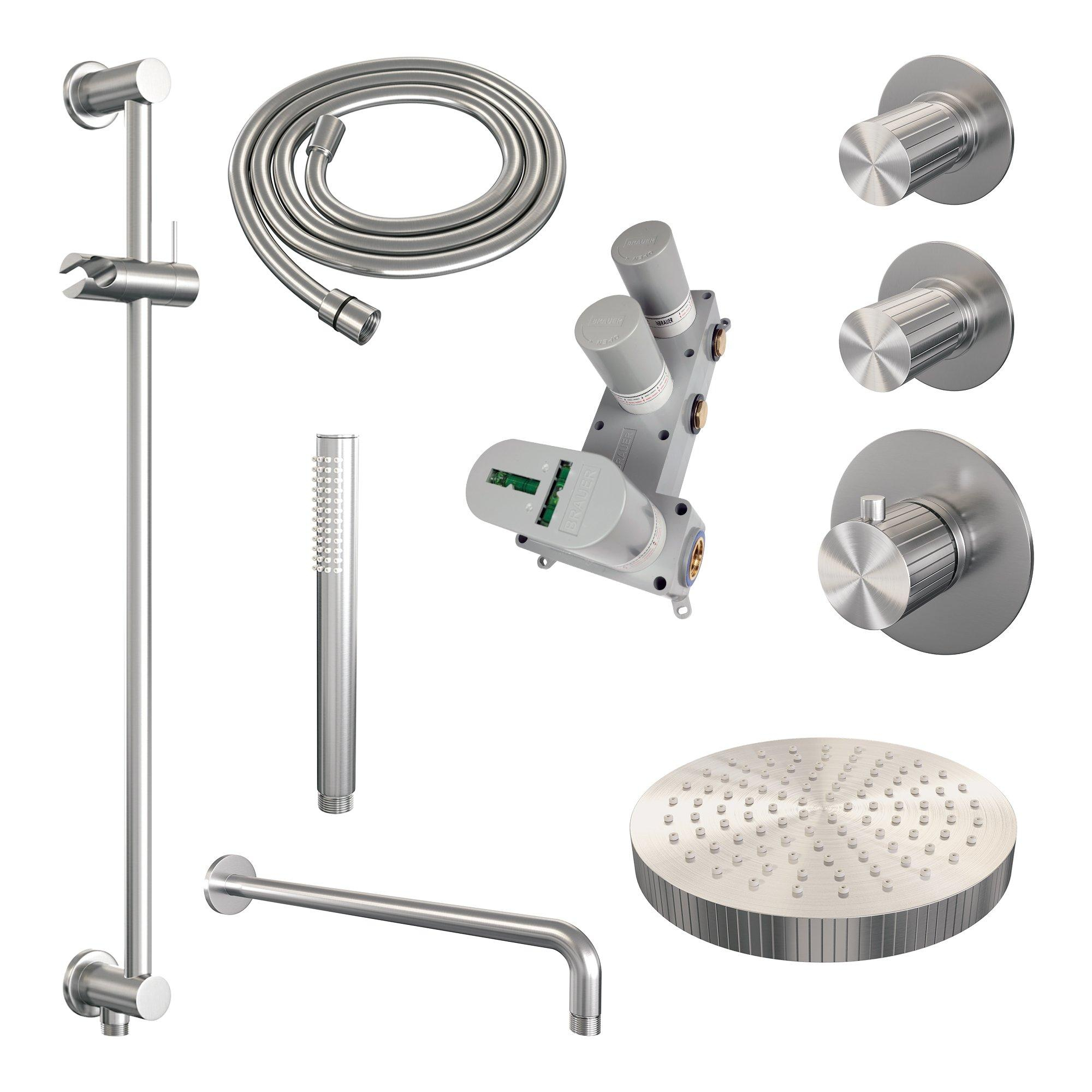 BRAUER Stripe Thermostatische Inbouw Regendouche - SET 08 - 25cm douchekop - gebogen muurarm - staaf handdouche - doucheslang - geïntegreerde glijstang - RVS-kleurig geborsteld PVD