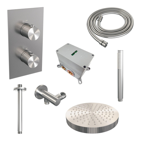 BRAUER Stripe Thermostatische Inbouw Regendouche - 3-weg - rechthoekig - SET 15 - 25cm douchekop - plafondarm - staaf handdouche - doucheslang - wandaansluitbocht - RVS-kleurig geborsteld PVD