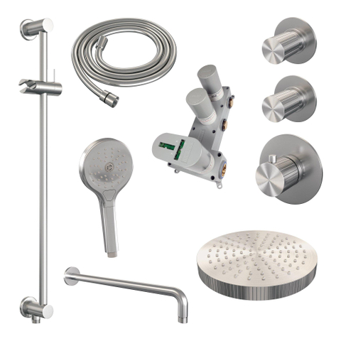 Stel je voor: een badkamer die niet alleen functioneel is, maar ook een oase van rust en luxe uitstraalt. Met deze regendouche set transformeer je jouw dagelijkse douchebeurt in een ware wellnesservaring. De combinatie van een royale 25 cm brede douchekop en een handdouche met drie verschillende standen geeft je alle vrijheid om jouw ideale waterstraal te kiezen. Dankzij het strakke, gebogen ontwerp en de hoogwaardige afwerking in geborsteld RVS-kleurig PVD voeg je een stijlvol en modern element toe aan je badkamer. De geïntegreerde glijstang zorgt voor extra gebruiksgemak en flexibiliteit, terwijl de thermostatische kraan zorgt voor een constante, comfortabele watertemperatuur. Zo geniet je elke dag opnieuw van een ontspannen en zorgeloze douchebeurt, die jouw badkamer een upgrade geeft op het gebied van comfort en design.