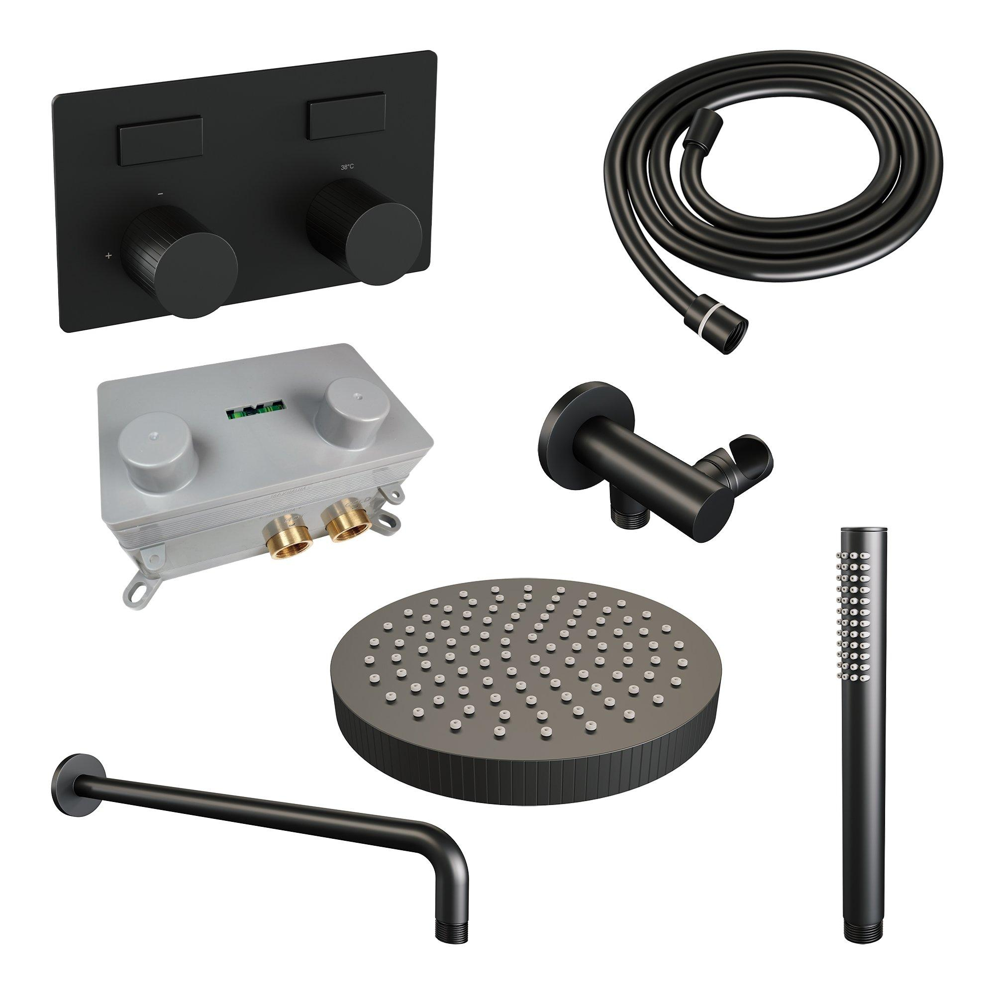 BRAUER Stripe Thermostatische Inbouw Regendouche - drukknoppen - SET 26 - 25cm douchekop - gebogen muurarm - staaf handdouche - doucheslang - wandaansluitbocht - mat zwart