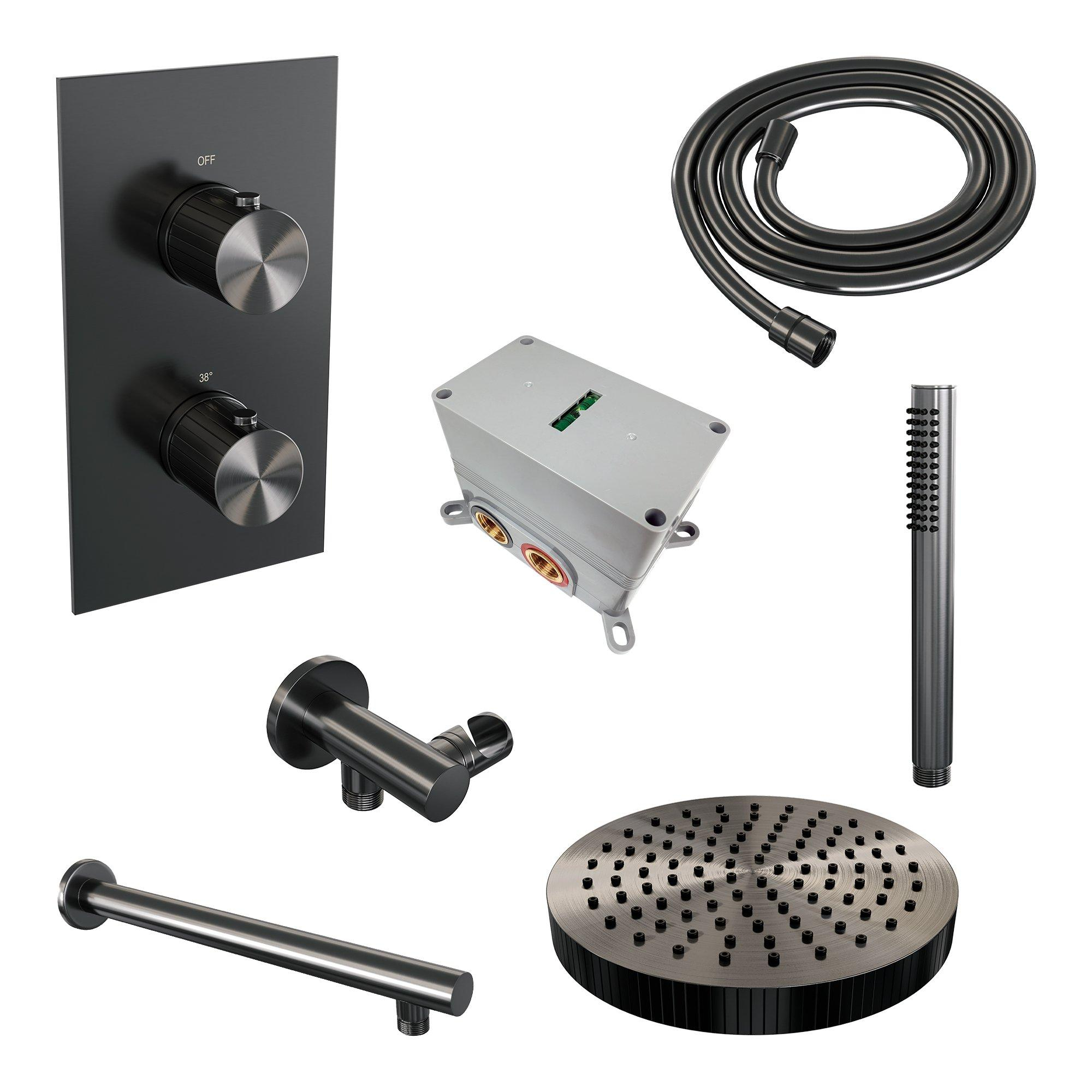 BRAUER Stripe Thermostatische Inbouw Regendouche - 3-weg - rechthoekig - 25cm douchekop - rechte muurarm - staaf handdouche - doucheslang - wandaansluitbocht - gunmetal geborsteld PVD