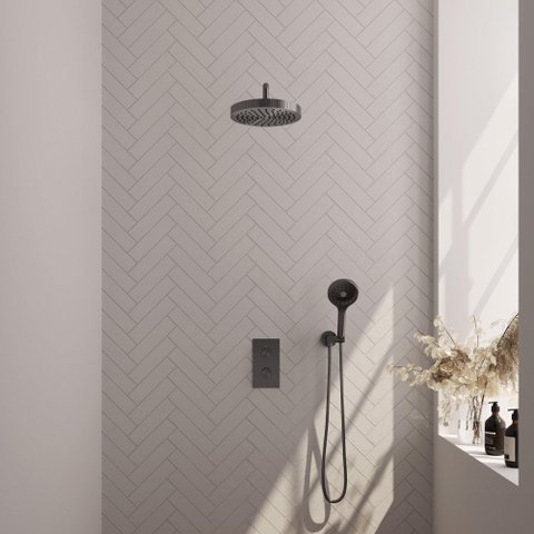 Stel je voor: een badkamer die niet alleen functioneel is, maar ook een oase van rust en stijl. Met deze inbouw regendouche transformeer je jouw douchehoek tot een luxe wellnessruimte waar je elke dag opnieuw van geniet. De royale douchekop zorgt voor een zachte, brede waterstraal die je omhult als een warme regenbui, terwijl de subtiele gebogen muurarm en het strakke, rechthoekige design een moderne en tijdloze uitstraling geven. Dankzij de thermostatische regeling geniet je altijd van de perfecte watertemperatuur, zonder schommelingen. De handdouche met drie standen biedt extra flexibiliteit, ideaal voor het gericht afspoelen of het schoonmaken van de douche. Met de hoogwaardige afwerking in gunmetal geborsteld PVD voeg je een stoer en elegant accent toe aan je badkamer, dat moeiteloos combineert met diverse interieurstijlen. Dit is niet zomaar een douche, maar een investering in comfort en design die jouw dagelijkse routine verrijkt.