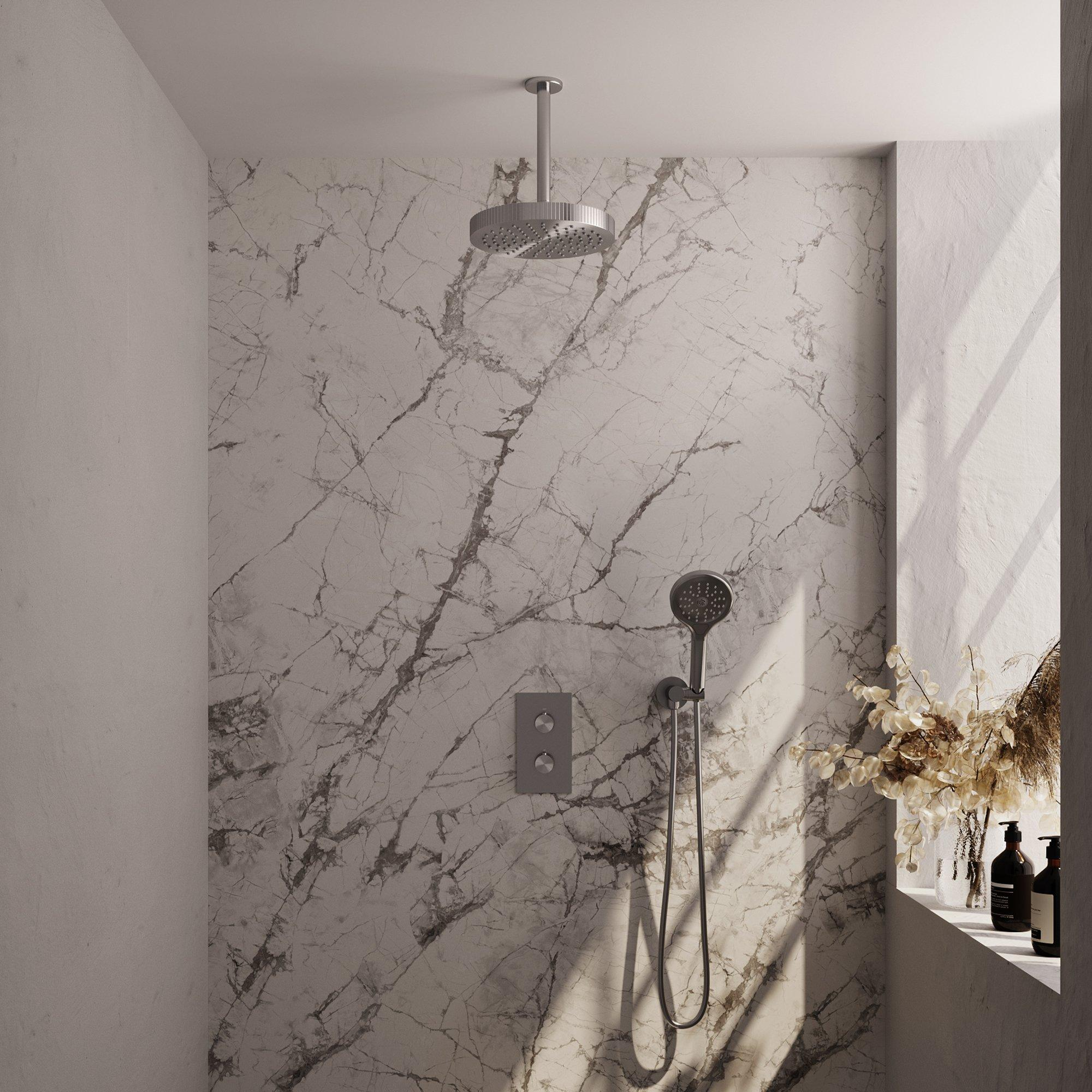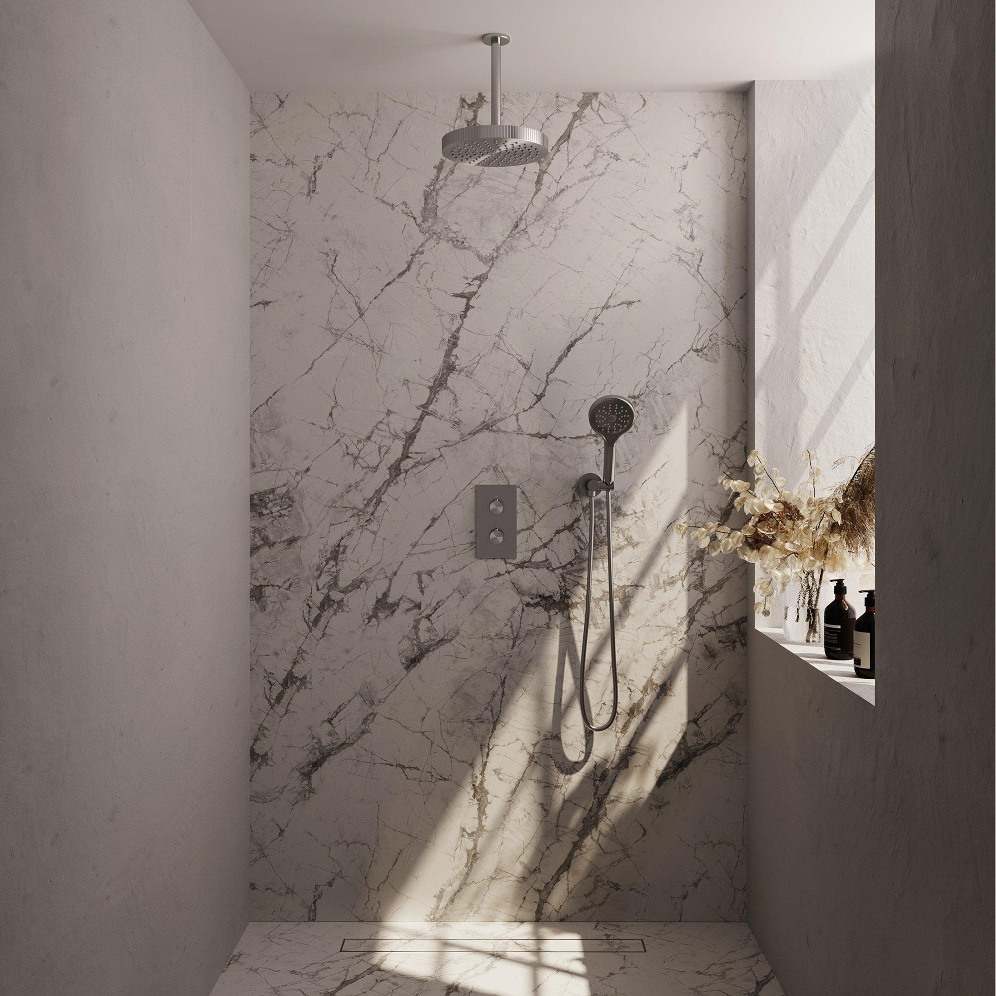 Met drie standen op de handdouche en een royale 25 cm hoofddouche met plafondarm, biedt dit systeem ongekende veelzijdigheid. Of je nu kiest voor een zachte regendouche, een krachtige straal of een gerichte massage, je past de waterstraal eenvoudig aan jouw wensen aan. De ingebouwde thermostaat zorgt voor een stabiele temperatuur, terwijl de twee knoppen een intuïtieve bediening garanderen. De meegeleverde doucheslang en wandaansluitbocht maken de installatie compleet en zorgen voor een nette afwerking. Zo geniet je van een gebruiksvriendelijke douche die perfect aansluit bij jouw dagelijkse routine.