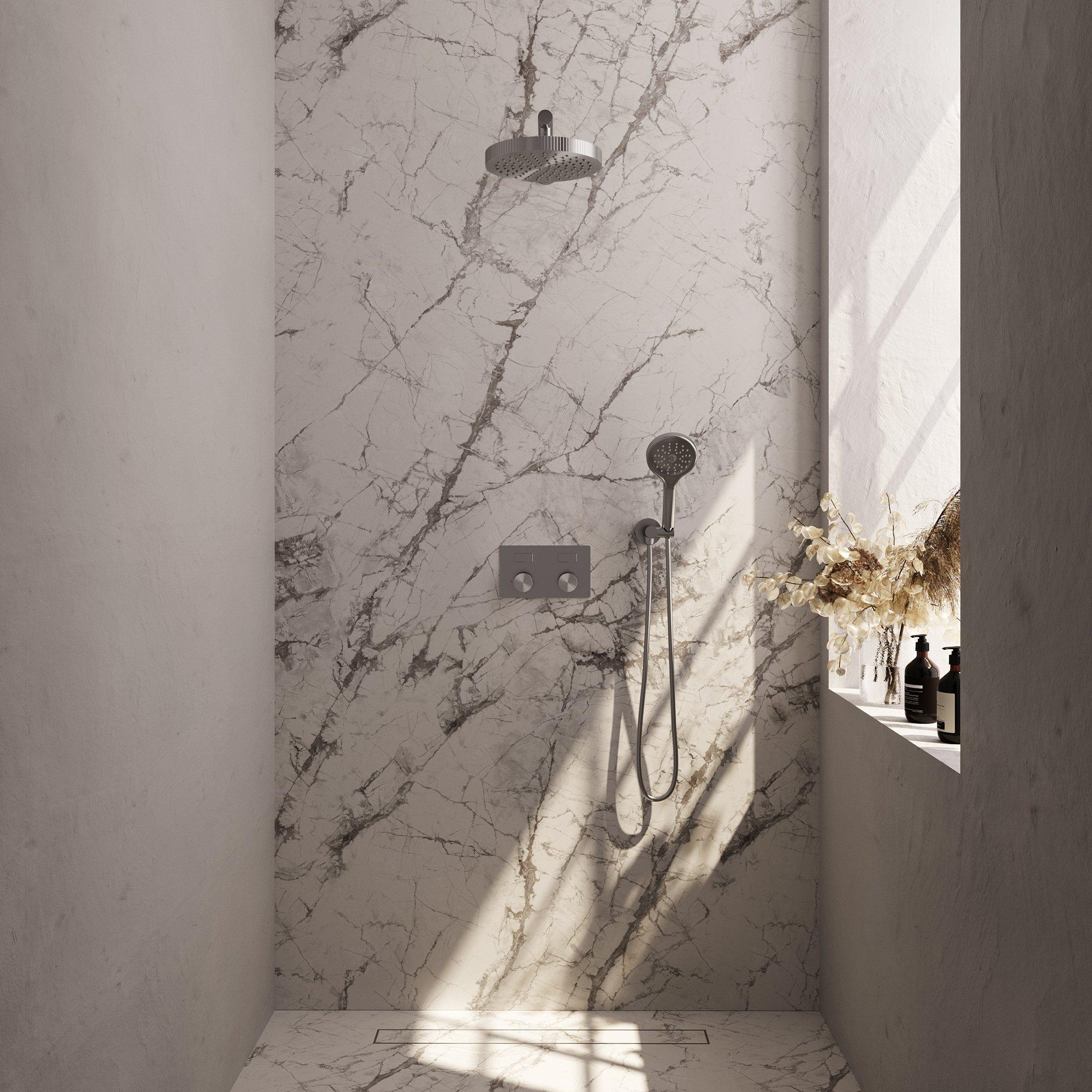 Gemaakt van hoogwaardig messing met een robuuste PVD-coating, staat deze regendouche garant voor jarenlang zorgeloos gebruik. De materialen zijn zorgvuldig gekozen om corrosie en slijtage tegen te gaan, waardoor je verzekerd bent van een betrouwbare kwaliteit. De thermostatische kraan zorgt bovendien voor een constante watertemperatuur, wat niet alleen comfortabel is maar ook waterbesparing stimuleert. Zo investeer je in een duurzame oplossing die bijdraagt aan een milieuvriendelijke badkamer.