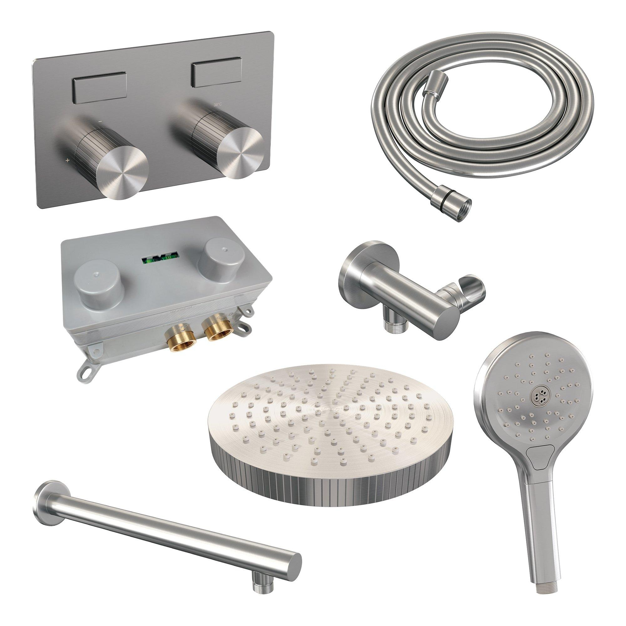 BRAUER Stripe Thermostatische Inbouw Regendouche - drukknoppen - 25cm douchekop - rechte muurarm - 3-standen handdouche - doucheslang - wandaansluitbocht - RVS-kleurig geborsteld PVD