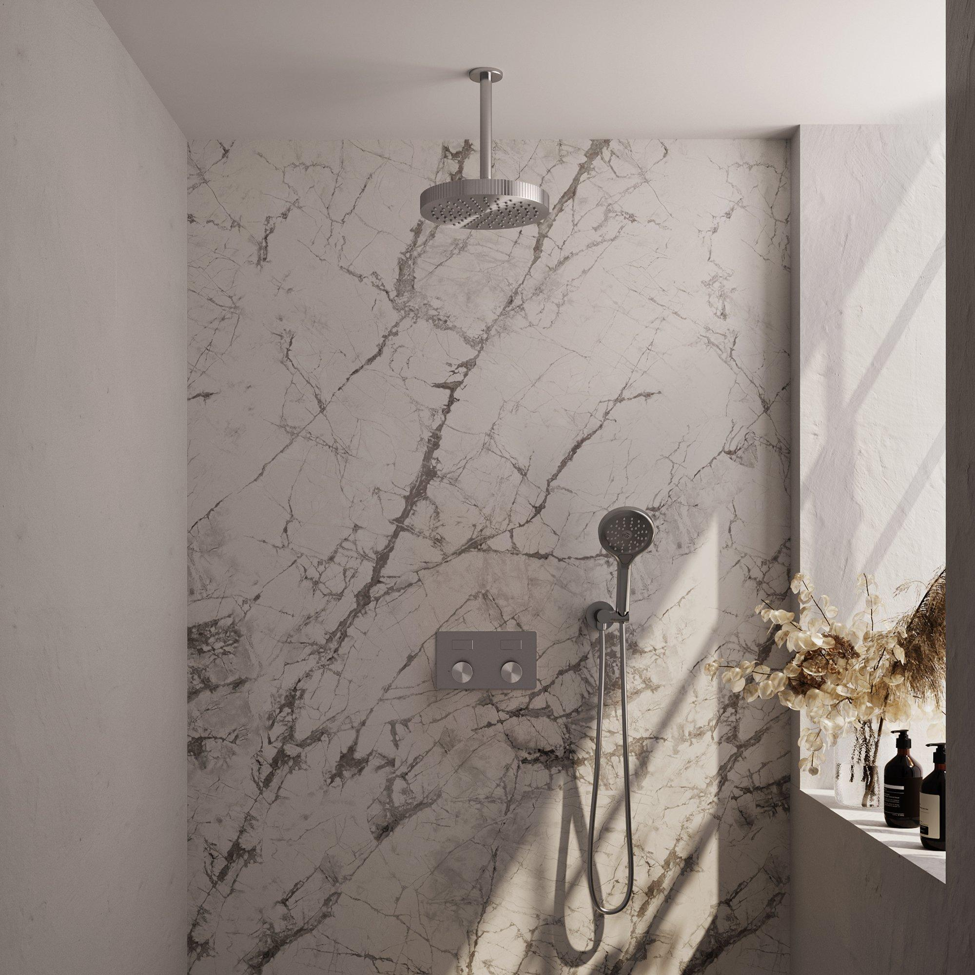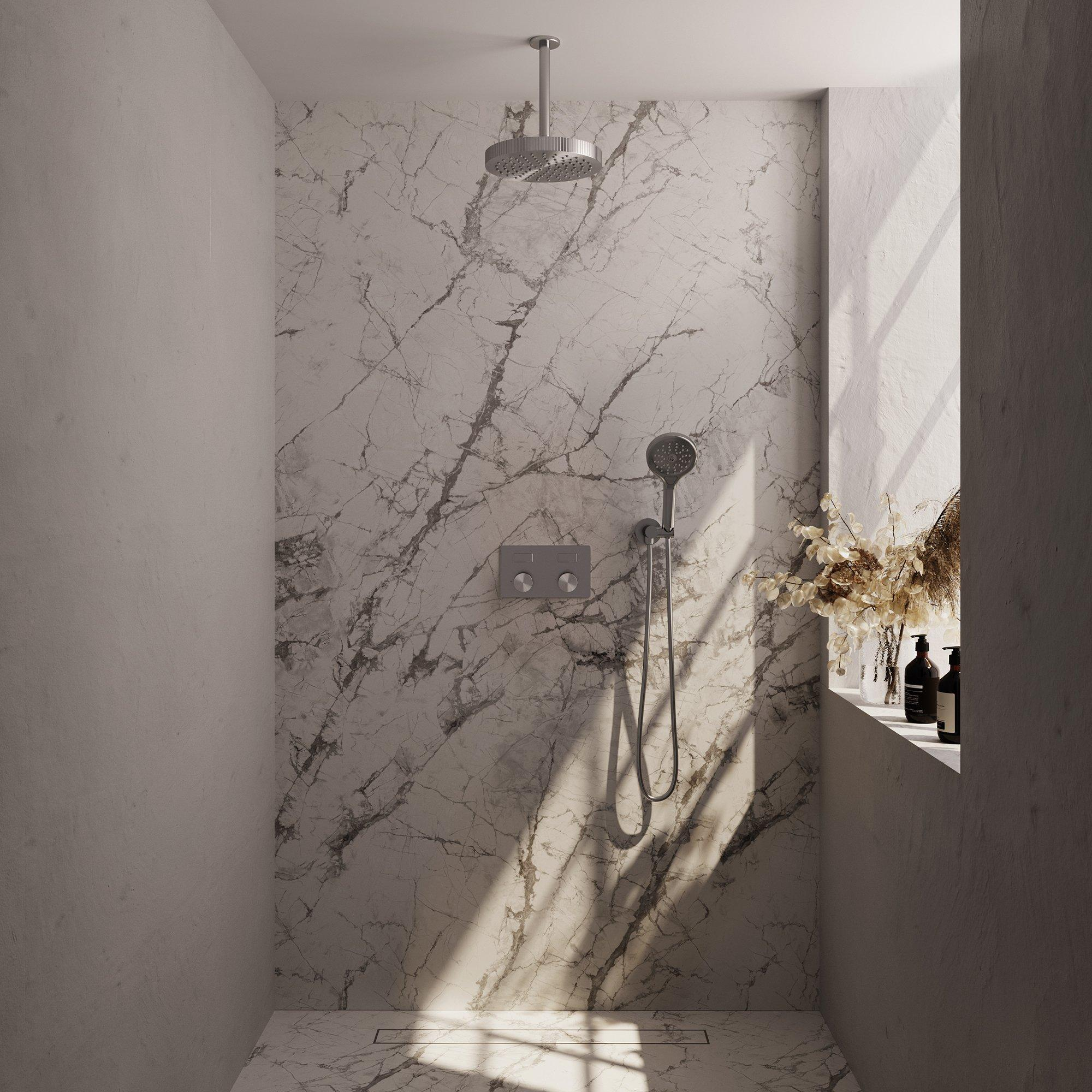 Stel je voor: een badkamer die niet alleen functioneel is, maar ook een oase van rust en luxe uitstraalt. Met deze inbouw regendouche transformeer je jouw dagelijkse douchebeurt in een ware wellnesservaring. Het strakke, geborsteld RVS design voegt een moderne en tijdloze uitstraling toe aan je badkamer, terwijl de slimme thermostatische bediening zorgt voor een constante, comfortabele watertemperatuur. Dankzij de royale 25 cm regendouchekop geniet je van een brede, zachte waterstraal die je volledig omhult. Bovendien biedt de handdouche met drie standen je de flexibiliteit om de douche precies aan te passen aan jouw wensen. Alles is ontworpen om jouw badkamer niet alleen mooier, maar ook praktischer en aangenamer te maken. Zo wordt douchen elke dag weer een moment om naar uit te kijken.