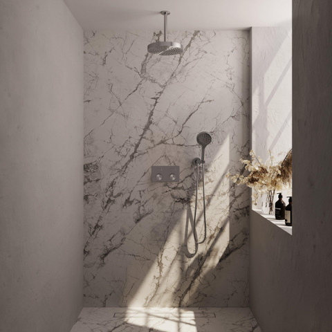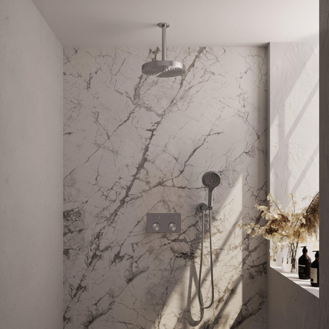 Deze inbouw regendouche is ontworpen met jouw gebruiksgemak in gedachten. De thermostatische bediening met vier drukknoppen maakt het eenvoudig om de temperatuur en waterstroom nauwkeurig te regelen. De 25 cm regendouchekop zorgt voor een brede, zachte waterstraal, terwijl de handdouche met drie standen je de vrijheid geeft om te kiezen tussen verschillende sproeipatronen. De meegeleverde plafondarm en wandaansluitbocht maken de installatie flexibel en netjes weggewerkt. Dankzij het inbouwontwerp blijft je badkamer strak en overzichtelijk, zonder zichtbare leidingen of kranen. Zo combineer je moeiteloos comfort met een opgeruimde uitstraling.