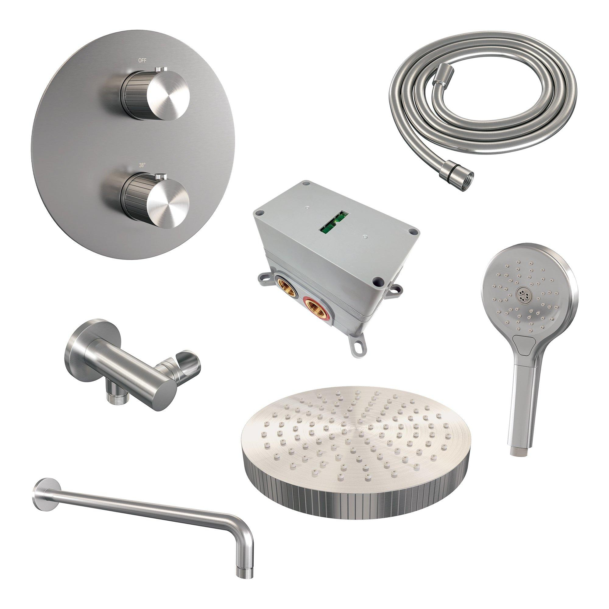 BRAUER Stripe Thermostatische Inbouw Regendouche - 3-weg - rond - 25cm douchekop - gebogen muurarm - 3-standen handdouche - doucheslang - wandaansluitbocht - RVS-kleurig geborsteld PVD