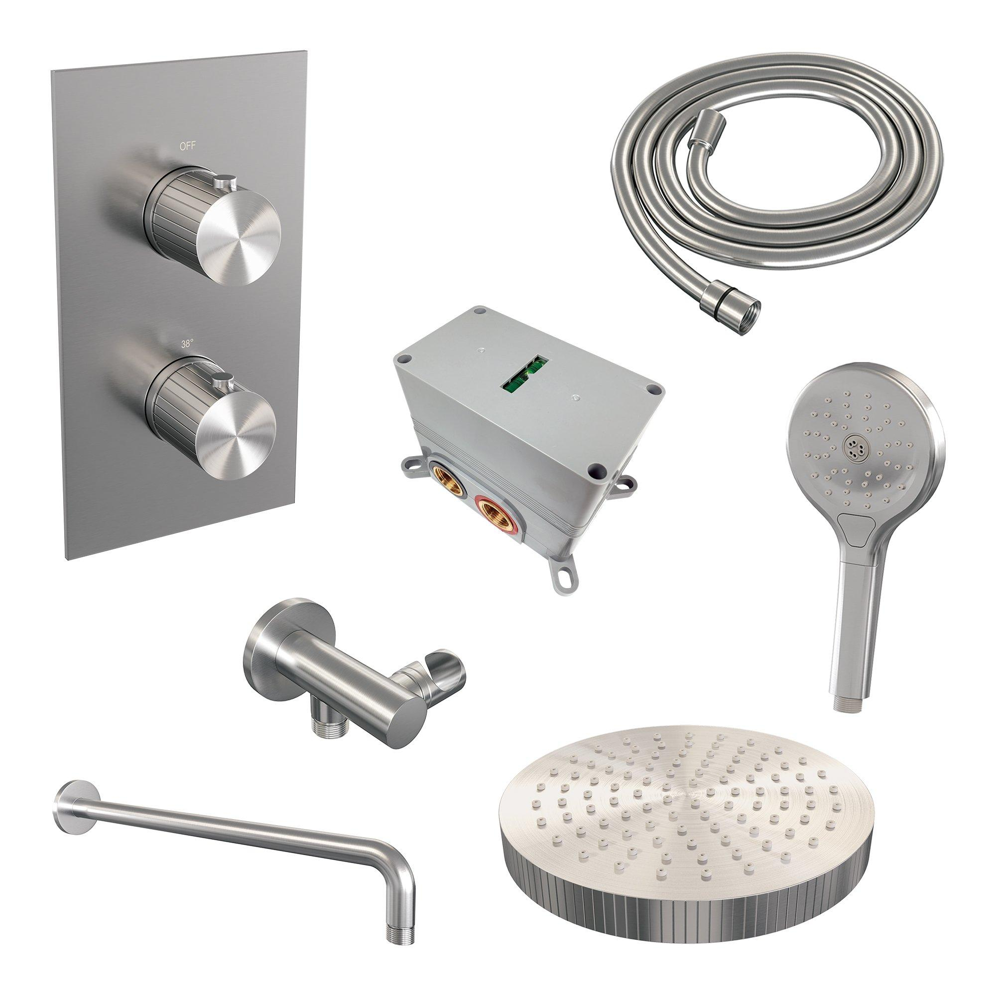 Stap onder een verfrissende regen van luxe met deze hoogwaardige inbouw regendouche. Deze complete set transformeert jouw badkamer in een oase van rust en comfort, waar je elke dag opnieuw kunt genieten van een ultieme douche-ervaring. Dankzij het strakke, rechthoekige design en de geborstelde RVS-kleurige afwerking krijgt je badkamer een moderne en tijdloze uitstraling. De combinatie van een royale 25 cm douchekop, een gebogen muurarm en een veelzijdige handdouche met drie standen zorgt ervoor dat je moeiteloos kunt schakelen tussen verschillende waterstromen. Zo pas je jouw douche helemaal aan naar jouw wensen en stemming. Bovendien biedt de thermostatische kraan optimale controle over de watertemperatuur, waardoor je veilig en comfortabel kunt douchen zonder plotselinge temperatuurschommelingen. Met deze set haal je niet alleen een functioneel product in huis, maar ook een stijlvol en duurzaam pronkstuk dat jarenlang meegaat.