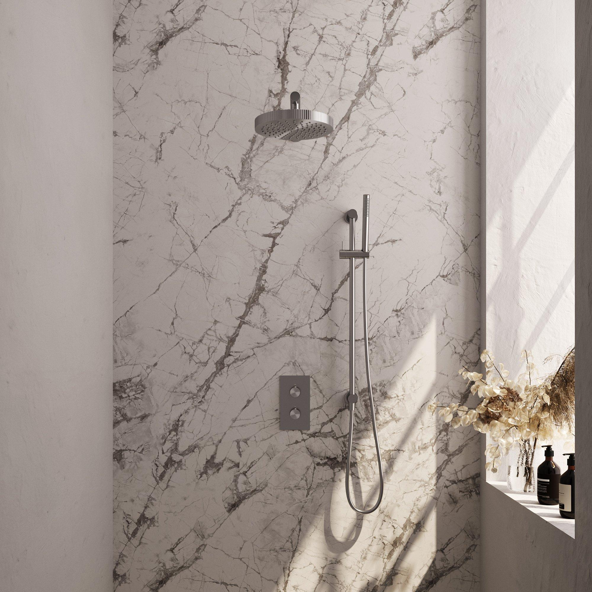 De strakke, rechthoekige vormgeving van de douchekop en de geborstelde PVD-afwerking geven deze regendouche een eigentijdse en luxe uitstraling. Dit maakt het een echte blikvanger in je badkamer. De RVS-kleurige tint zorgt voor een subtiele glans die niet snel zal vervelen en perfect combineert met andere badkameraccessoires. Door het minimalistische design past deze set moeiteloos in zowel moderne als klassieke badkamers. Zo voeg je stijl toe zonder dat het overheerst, waardoor je badkamer een harmonieuze en uitnodigende sfeer krijgt.