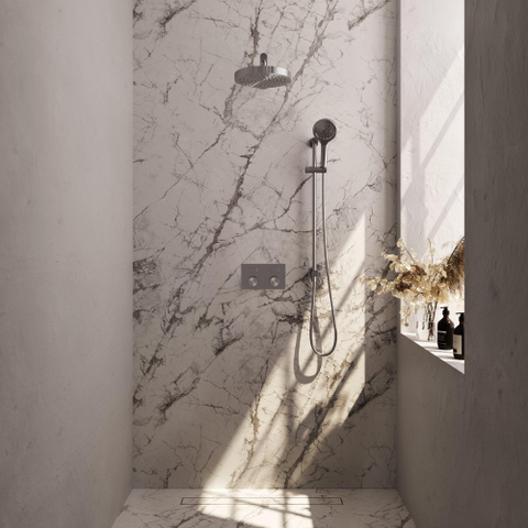 De thermostatische bediening met vier drukknoppen maakt het instellen van de watertemperatuur en het wisselen tussen de hoofddouche en handdouche eenvoudig en intuïtief. Met de drie standen van de handdouche pas je de waterstraal aan naar jouw voorkeur, of je nu kiest voor een krachtige straal of een zachte massage. De geïntegreerde glijstang zorgt voor flexibiliteit in hoogte en positie, wat het douchen comfortabeler maakt voor iedereen in het gezin. Dankzij de inbouwmontage blijft de badkamer strak en overzichtelijk, zonder zichtbare leidingen of kranen die uitsteken. Zo combineer je moeiteloos gebruiksgemak met een verzorgde uitstraling.