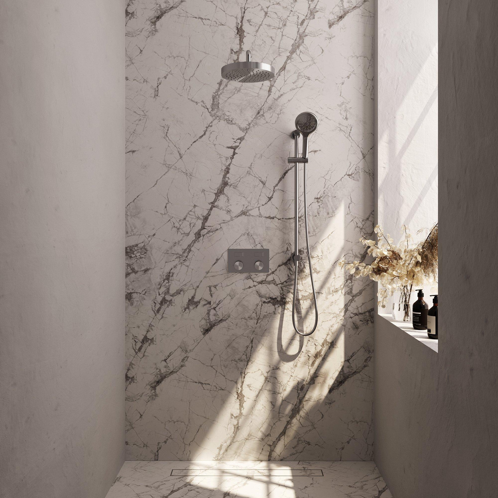 Transformeer jouw badkamer met deze luxe inbouw regendouche die niet alleen een visueel statement maakt, maar ook een ongeëvenaarde douche-ervaring biedt. Dankzij het strakke ontwerp en de hoogwaardige afwerking in geborsteld RVS-kleurig PVD voeg je een moderne en tijdloze uitstraling toe aan je badkamer. De royale 25 cm douchekop zorgt voor een brede, zachte waterstraal die je omhult in comfort, terwijl de geïntegreerde glijstang en de handdouche met drie standen je maximale flexibiliteit geven. Met de slimme drukknoppen bedien je moeiteloos de verschillende functies, waardoor douchen niet alleen praktisch maar ook bijzonder plezierig wordt. Deze set is ontworpen voor inbouwmontage, wat zorgt voor een strakke, naadloze afwerking die jouw badkamer een luxe en rustige sfeer geeft. Zo wordt elke douchebeurt een moment van ontspanning en verwennerij.