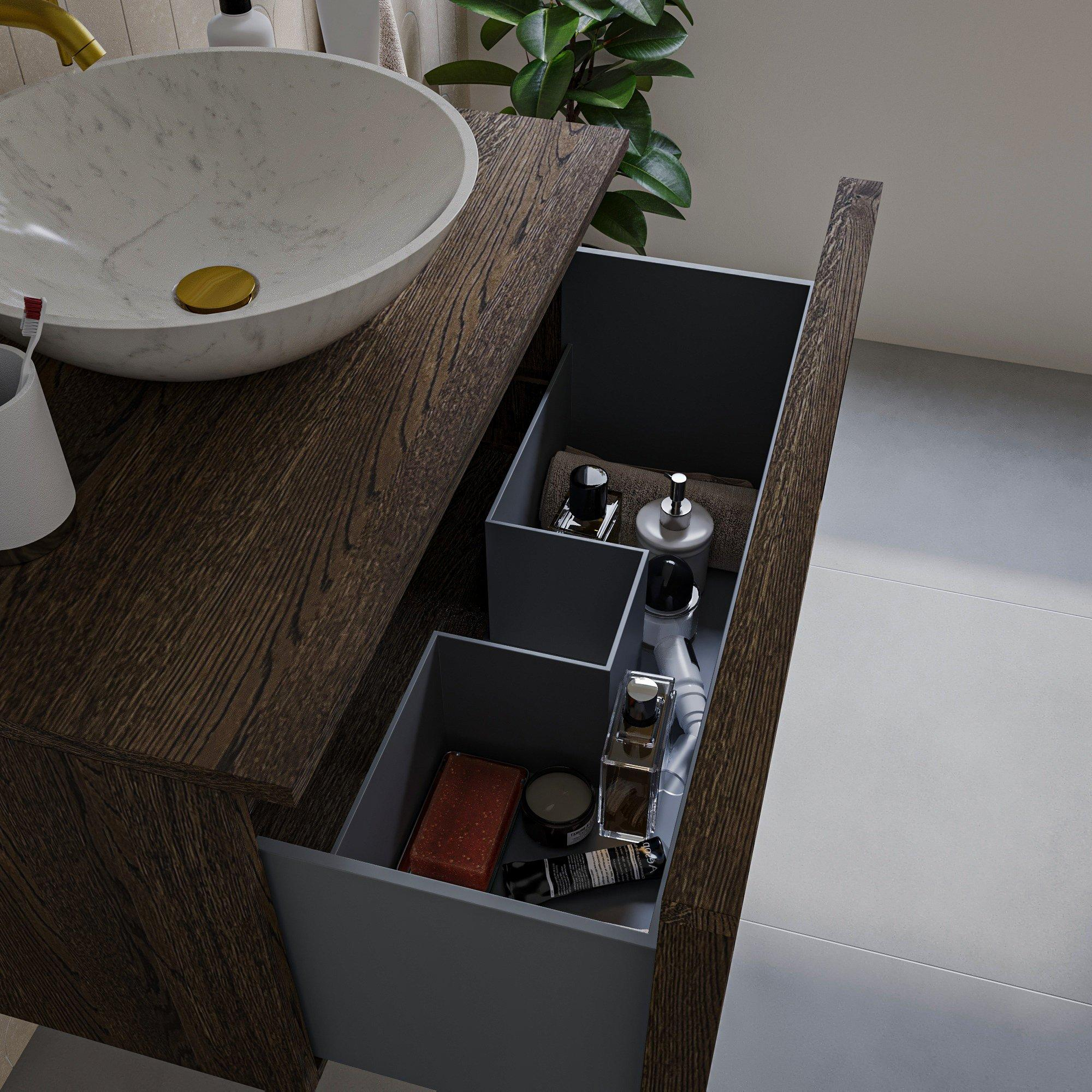 Met deze badkamermeubelset geef je jouw badkamer een warme en natuurlijke uitstraling die direct uitnodigt tot ontspanning. Het massief eikenhout in de kleur charcoal zorgt voor een tijdloze en robuuste sfeer, terwijl het compacte formaat perfect past in zowel kleinere als grotere badkamers. Dankzij de slimme indeling met één ruime lade berg je al je badkamerbenodigdheden netjes en overzichtelijk op. Het bijgeleverde topblad maakt het geheel compleet en biedt een stevige, stijlvolle afwerking. Zo transformeer je jouw badkamer in een plek waar functionaliteit en design hand in hand gaan, en waar je elke dag met plezier begint en eindigt.