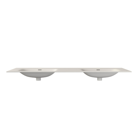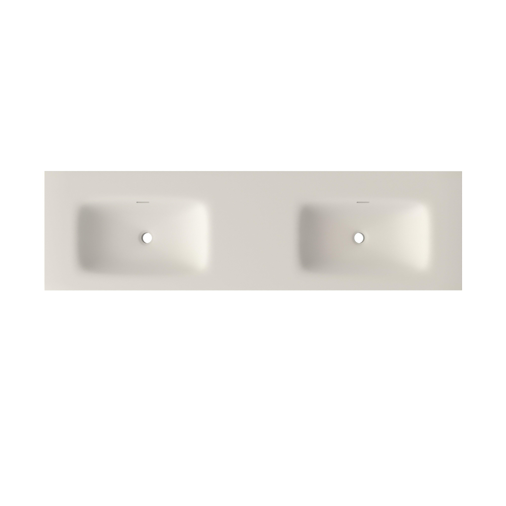 Met twee ruime wasbakken naast elkaar biedt dit meubel volop ruimte om samen te gebruiken zonder elkaar in de weg te zitten. Dit maakt het ideaal voor drukke ochtenden of gedeelde badkamers. De geïntegreerde overloop zorgt ervoor dat water netjes wordt afgevoerd, wat extra veiligheid en gebruiksgemak biedt. Doordat er geen kraangaten zijn, kun je zelf kiezen welke kranen het beste bij jouw stijl en wensen passen, wat de wastafel extra flexibel maakt.Onderhoudsvriendelijk en duurzaam solid surface