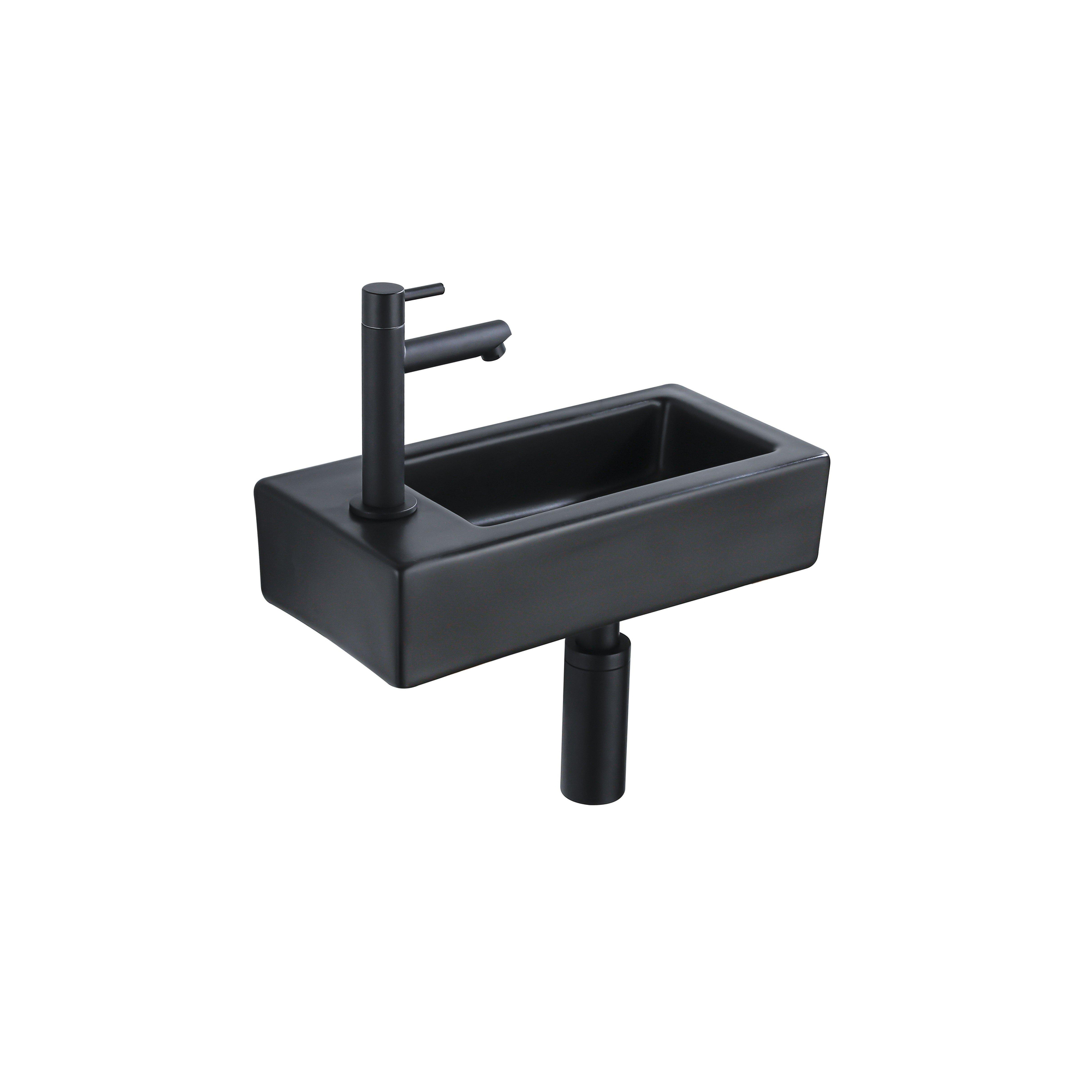 De FugaFlow Efficiente Pietra Fonteinset straalt stijl en elegantie uit met zijn moderne ontwerp en matte zwarte afwerking. Het kraangat aan de linkerkant zorgt voor een gestroomlijnde look, terwijl de fonteinkraan in mat zwart een vleugje luxe toevoegt aan elke badkamer. De combinatie van keramiek en verlaagd sifon zorgt voor duurzaamheid en een naadloze afwerking.