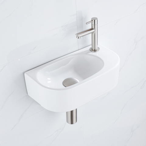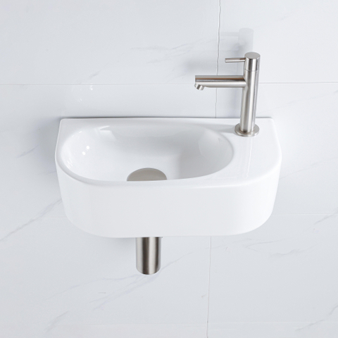 Fugaflow Efficiente Pietra Fonteinset - 40x21.5x12cm - rechts - glad - halfrond - 1 kraangat - keramiek - fonteinkraan geborsteld rvs - afvoerplug - verlaagd sifon - wit glans