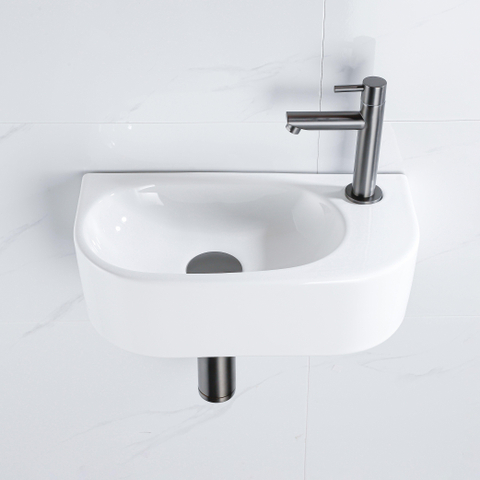 Fugaflow Efficiente Pietra Fonteinset - 40x21.5x12cm - rechts - glad - halfrond - 1 kraangat - keramiek - fonteinkraan gunmetal - afvoerplug - verlaagd sifon - wit glans