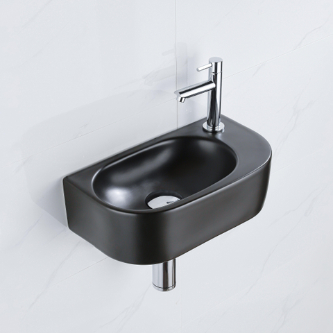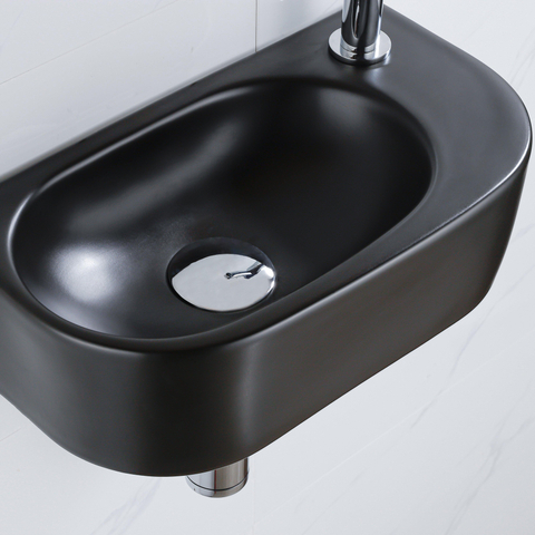 Fugaflow Efficiente Pietra Fonteinset - 40x21.5x12cm - rechts - glad - halfrond - 1 kraangat - keramiek - fonteinkraan chroom - afvoerplug - verlaagd sifon - zwart mat