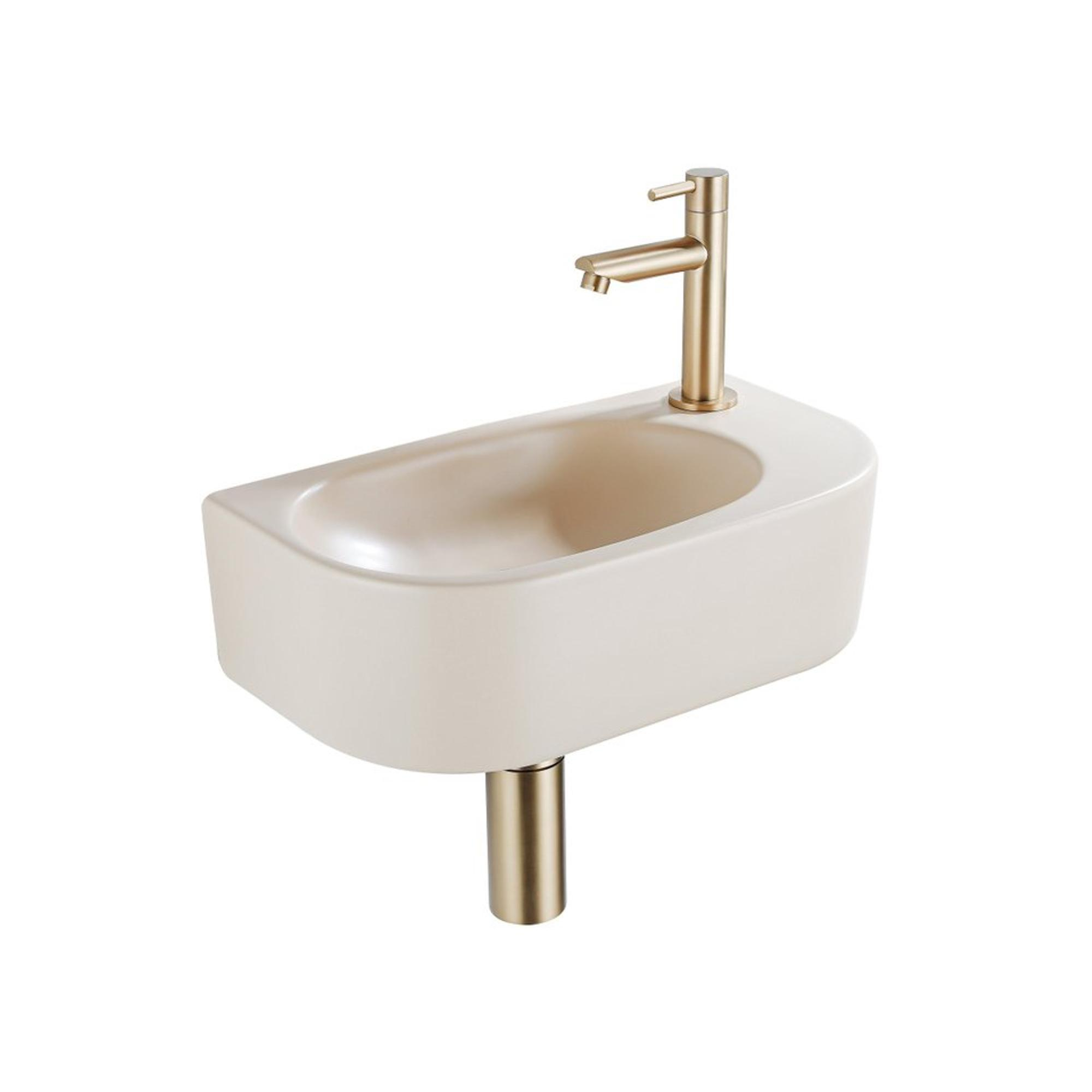 Fugaflow Efficiente Pietra Fonteinset - 40x21.5x12cm - rechts - glad - halfrond - 1 kraangat - keramiek - fonteinkraan geborsteld messing - afvoerplug - verlaagd sifon - beige