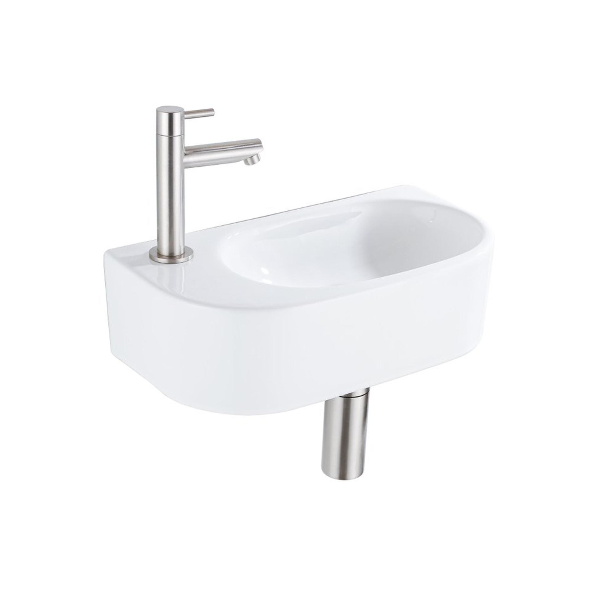 Fugaflow Efficiente Pietra Fonteinset - 40x21.5x12cm - links - glad - halfrond - 1 kraangat - keramiek - fonteinkraan geborsteld rvs - afvoerplug - verlaagd sifon - wit glans
