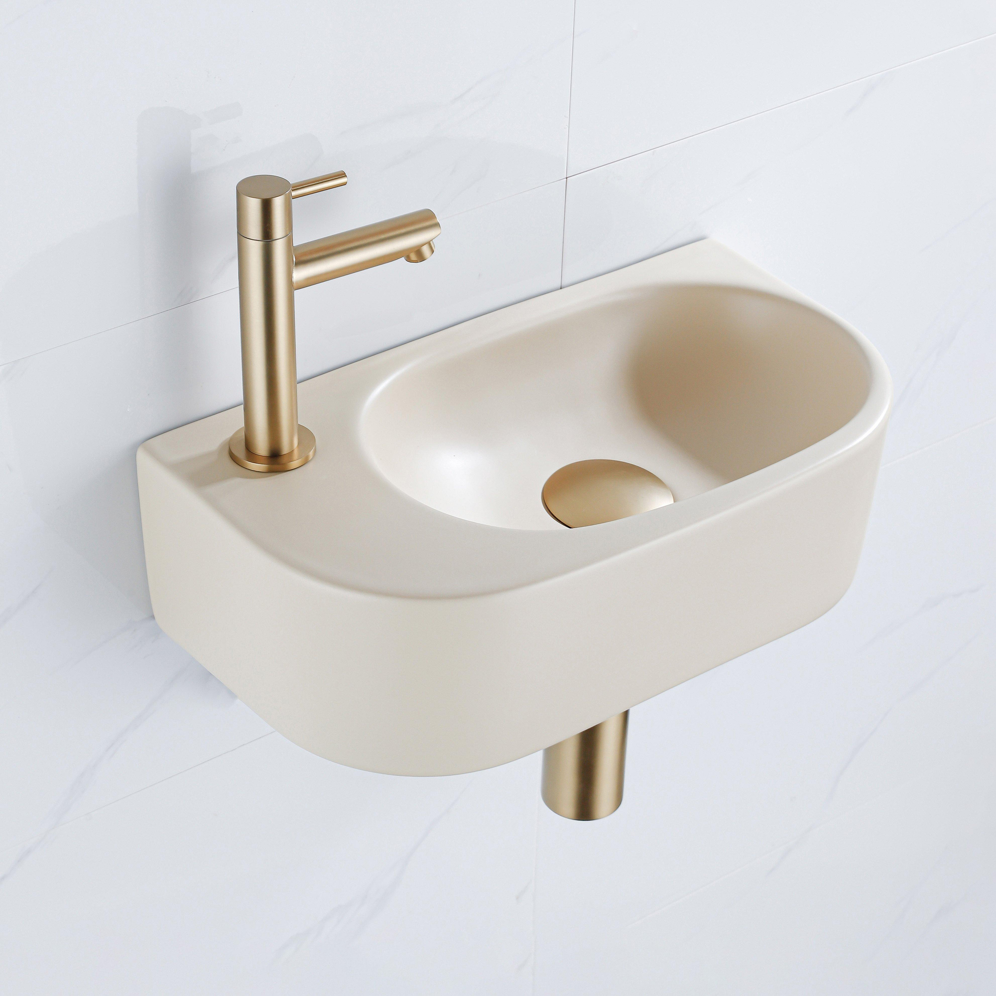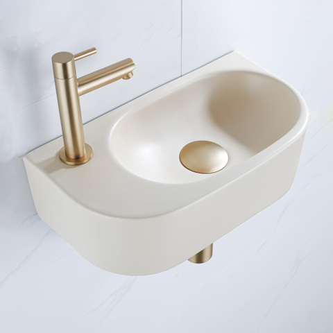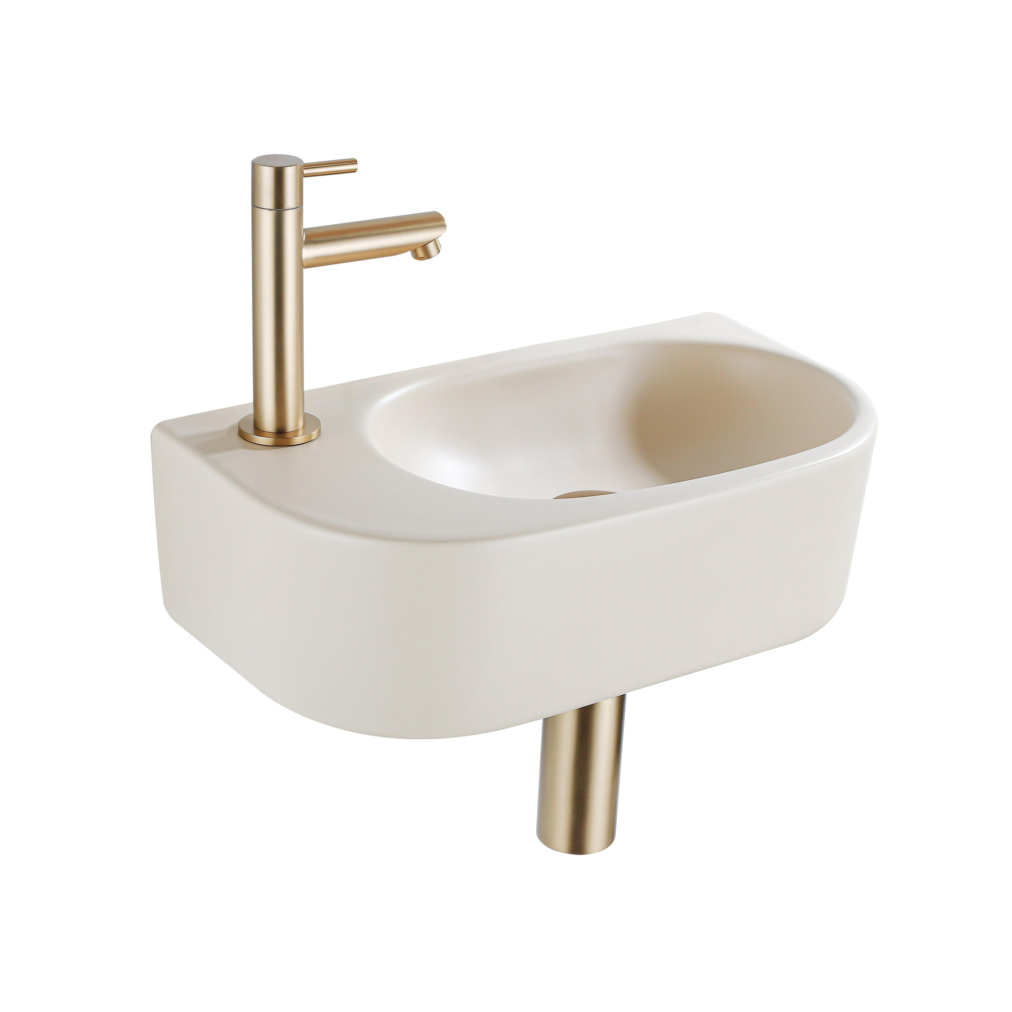 Fugaflow Efficiente Pietra Fonteinset - 40x21.5x12cm - links - glad - halfrond - 1 kraangat - keramiek - fonteinkraan geborsteld messing - afvoerplug - verlaagd sifon - beige
