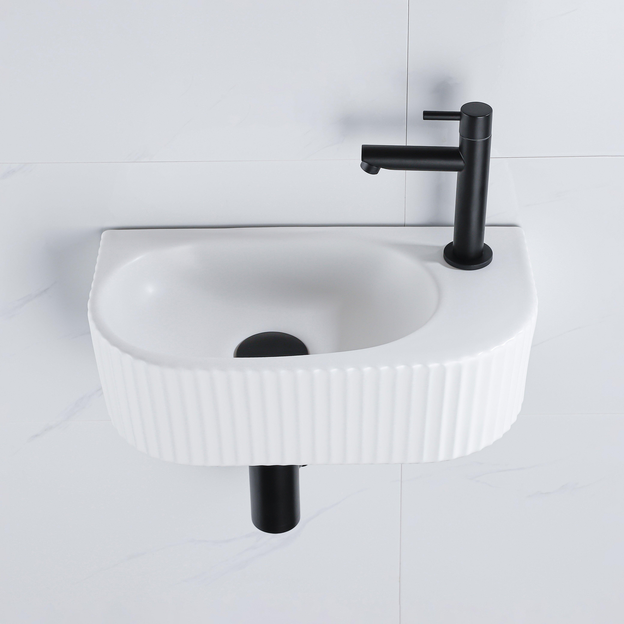 Fugaflow Efficiente Pietra Fonteinset - 40x21.5x12cm - rechts - geribbeld - halfrond - 1 kraangat - keramiek - fonteinkraan zwart mat - afvoerplug - verlaagd sifon - wit mat